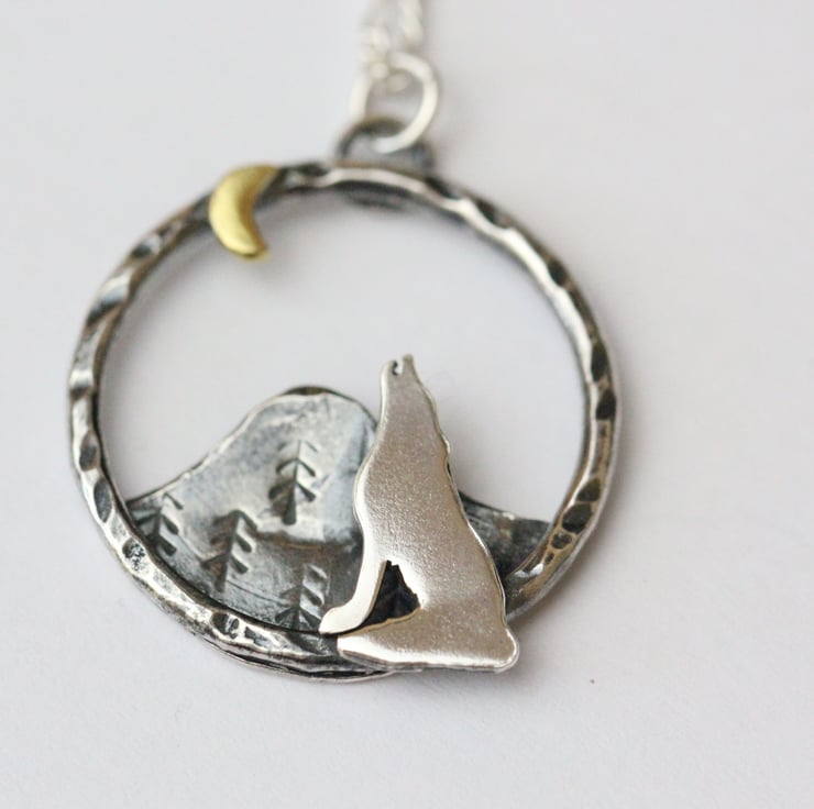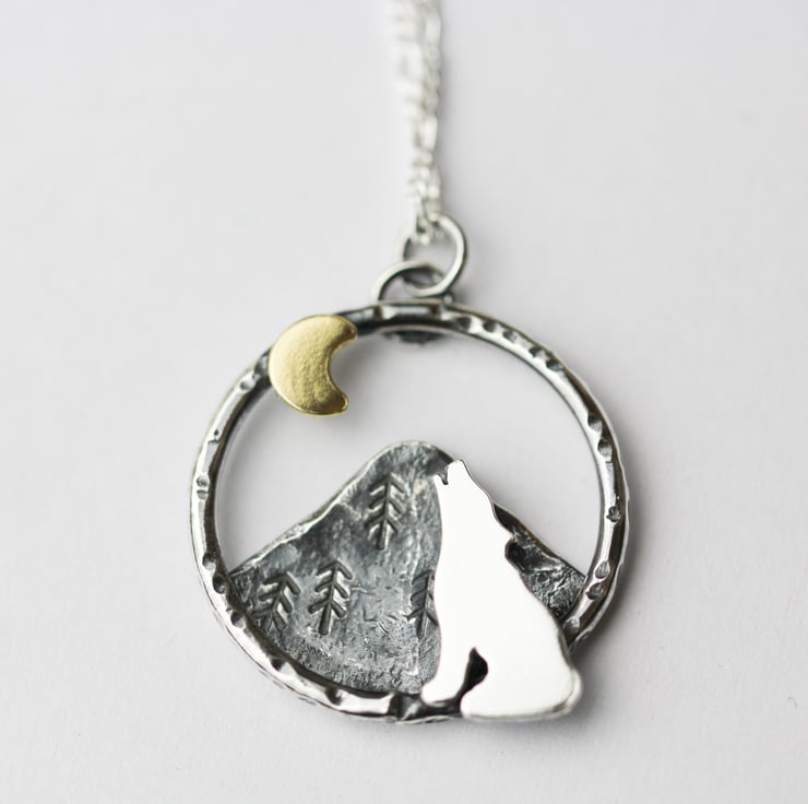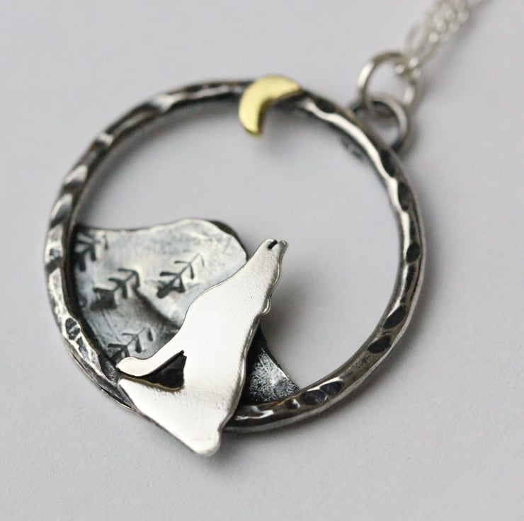 This howling wolf necklace is made from sterling silver and brass. Each part of the piece has been hand sawn from sheet metal.