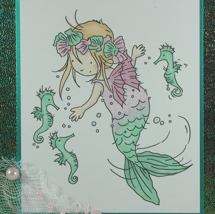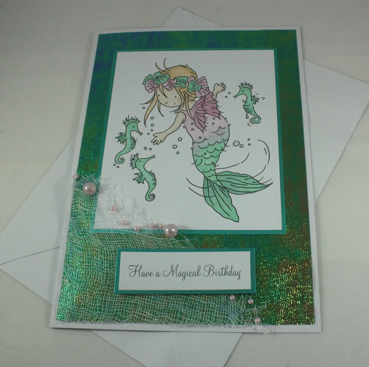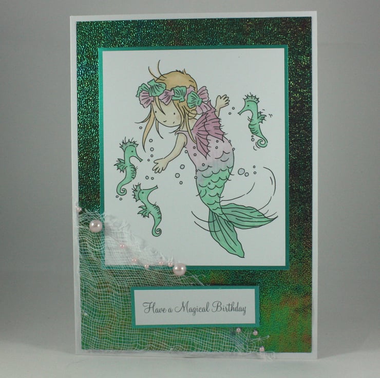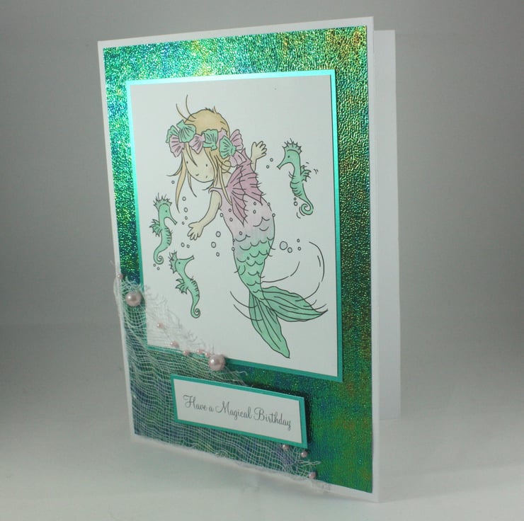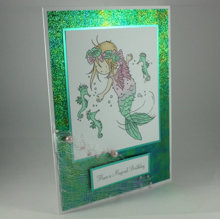 A5 birthday card featuring a hand coloured image of a mermaid swimming with 3 seahorses. The image and the sentiment 'Have a Magical Birthday' have been mounted onto pearlescent green card over a shimmering blue/gold/green background . The card is embellished with a 'fishing net' made from cheesecloth and pink pearl beads.