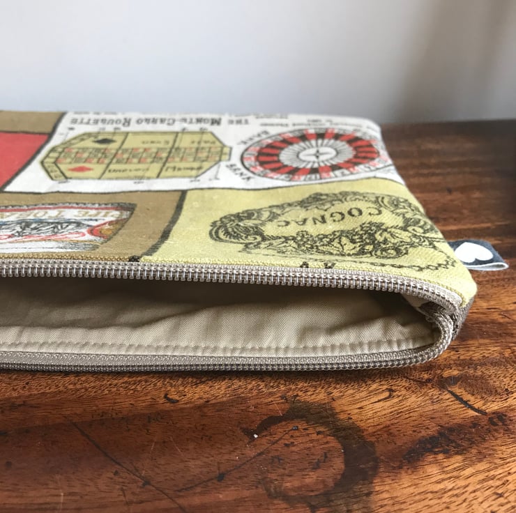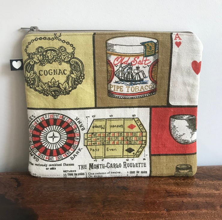 Large zip pouch in ‘minor vices’ vintage fabric, backed with a textured brown fabric.