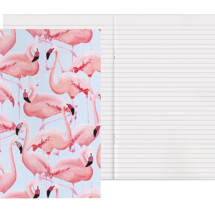 An A5 notebook with lined pages. The cover features a fun hand drawn pattern of a flamboyance of flamingos.
