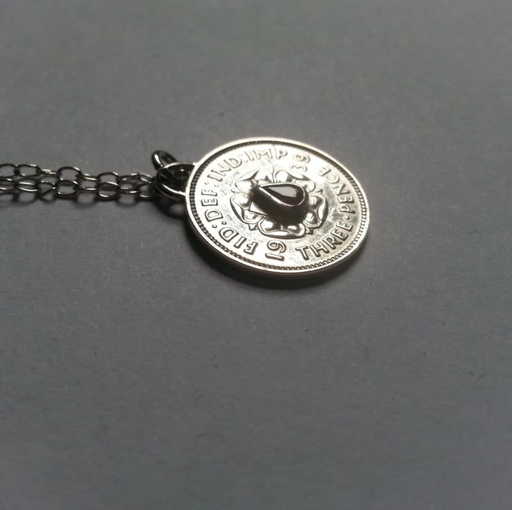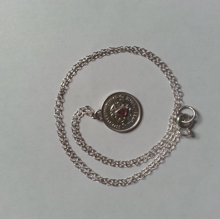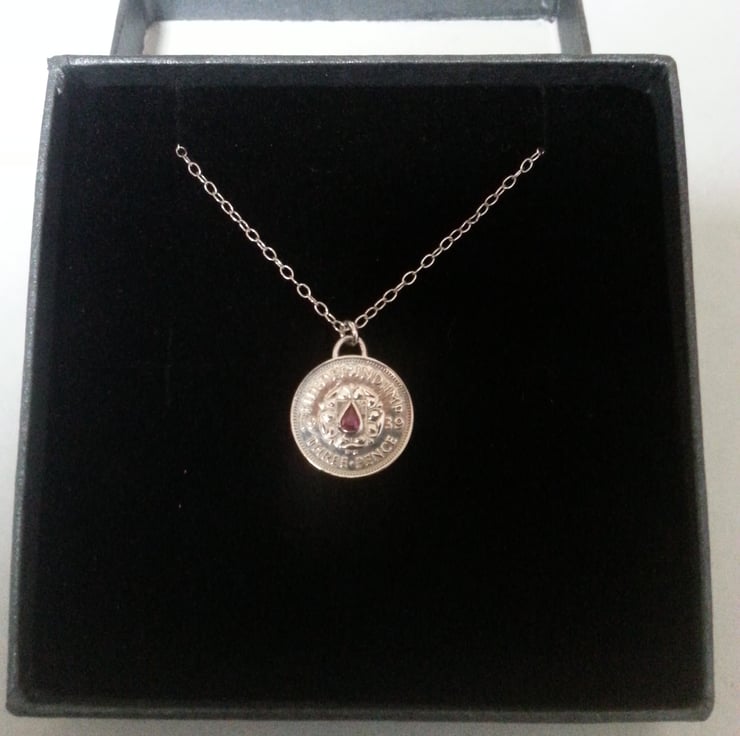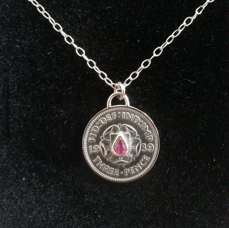This is an authentic 1939 Threepence which has been enhanced with a ruby coloured Sapphire .It would make a special gift for an anniversary or birthday.