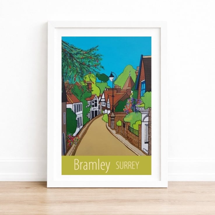 A contemporary travel poster style print of the lovely Surrey village of Bramley, from my own original acrylic painting. A perfect gift for those who love Bramley!