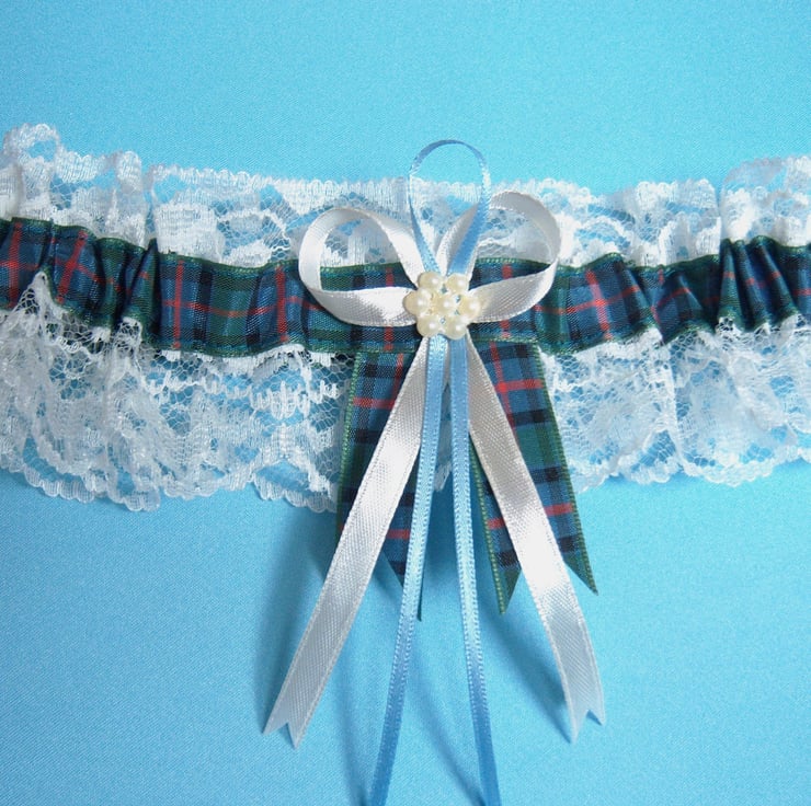 This is a handmade ivory lace wedding bridal garter made with authentic Flower of Scotland tartan ribbon.