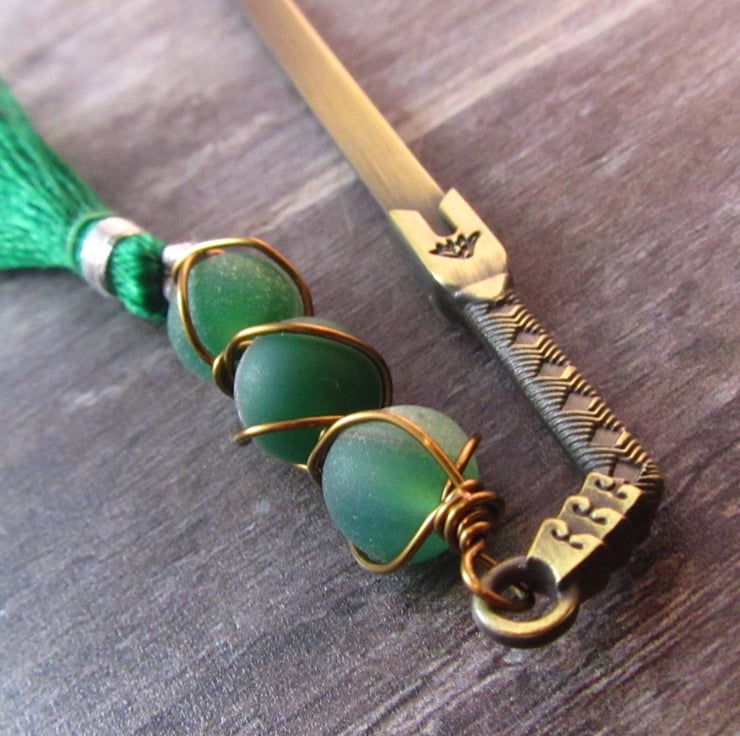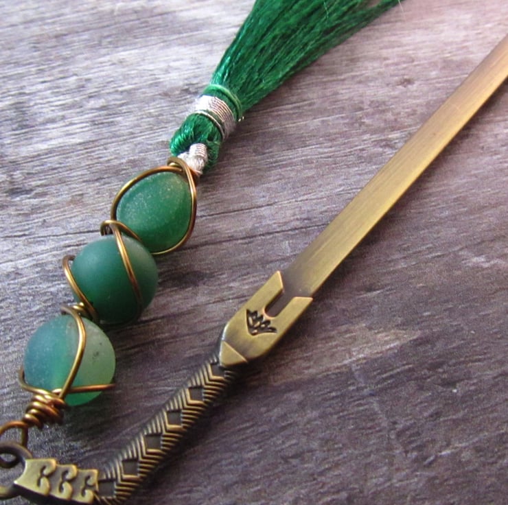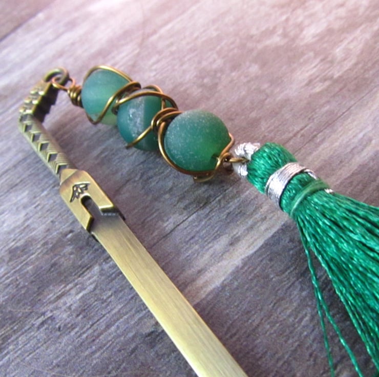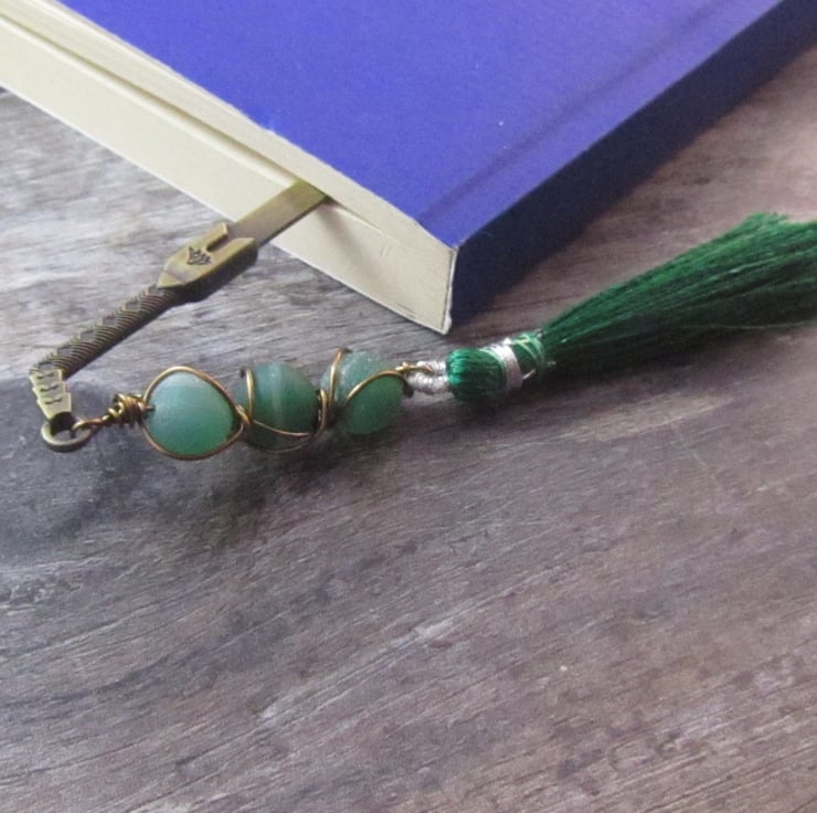 A beautiful frosted green agate wire wrapped sword bookmark. It is created with real frosted green agate gemstones, antique bronze colour silver plated copper wire, a tassel, and the bronze colour sword is a zinc alloy. It would be the perfect gift for anyone who likes swords, fantasy or reading.