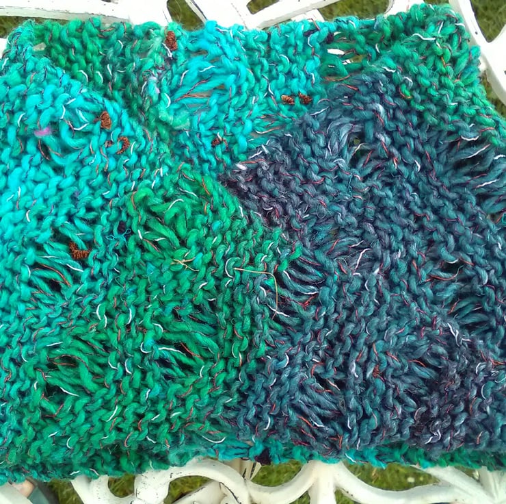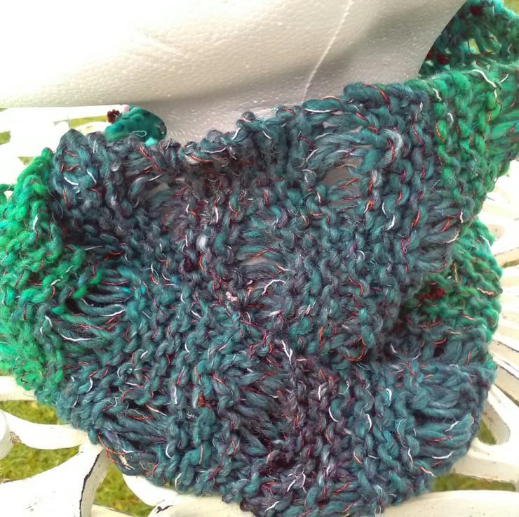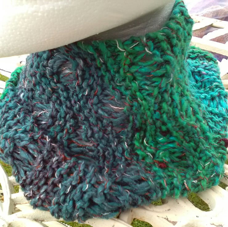 They are made from a sumptious soft cotton & silk, self colour banding yarn. I have designed a loopy stitch which joins on the twist with a grafted seam. The beauty of these is in the colour changes and depending on what you are wearing you can place your favourite colour of the day at the front. The stitch works either way round. Perfect for the Mobius band.