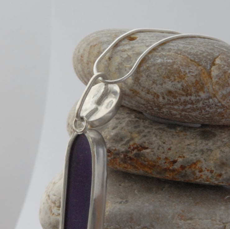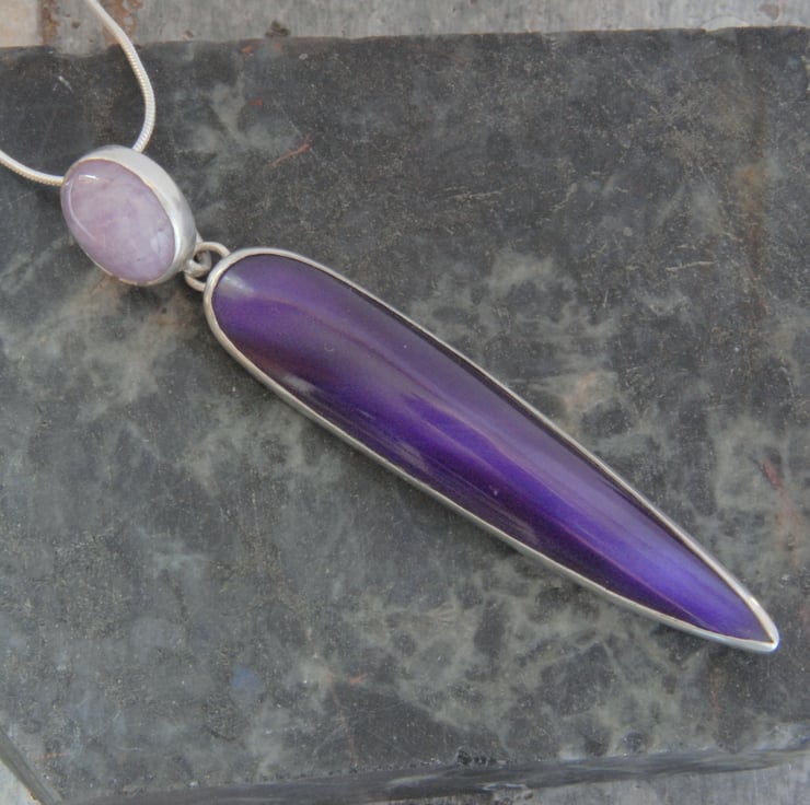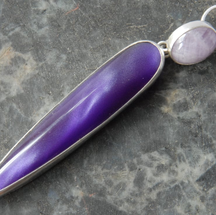 This striking pendant features a long drop of deep purple bowlerite which hangs beneath a lilac amethyst cabochon, both pieces have been bezel set in sterling silver with a point of articulation between them. The generous bail is hidden behind the amethyst and would easily fit a ribbon, leather thong or (probably) a torque if you prefer one of those to the chain that it is supplied with (those alternatives aren't included but if you would like me to source one of these for you then drop me a message). Bowlerite is the name give to the hard plastic recovered from the outside of vintage bowling balls when they are too beat up to roll down the lanes any more, this ball was probably from the 60's or 70's and is a windsor purple with a silvery sheen swirling through it, the articulation in the piece allows it to move and the light to catch the sparkles.