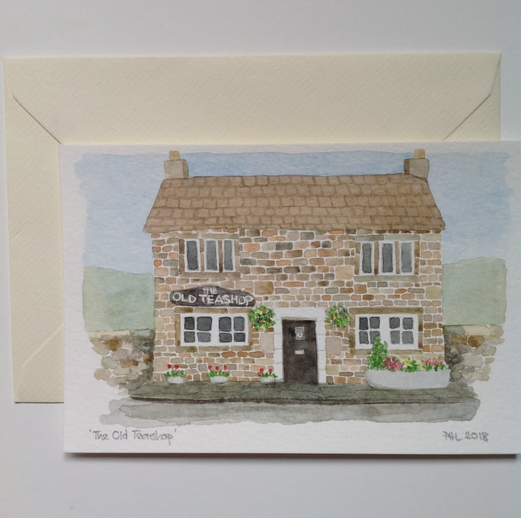 This pretty watercolour of a village teashop has been painted onto a Winsor and Newton 300gsm postcard using professional quality watercolour paints. It measures 6 x 4 inches (15.2cm x 10.2cm). The postcard is able to be used for writing on the back and comes with a cream envelope for posting.