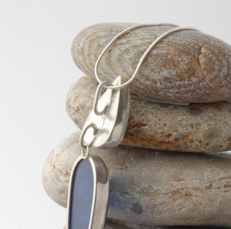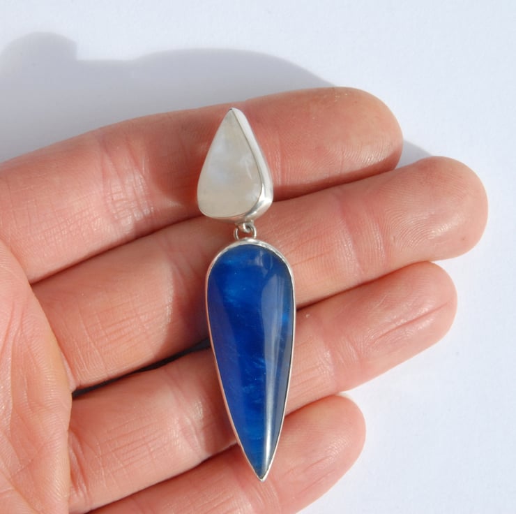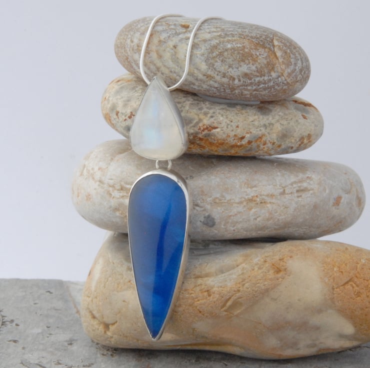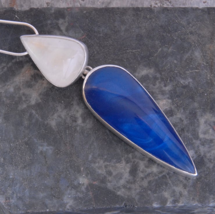 This unusual pendant features rainbow moonstone and bowlerite bezel set to look like the moon over the night sea, the bowlerite is a deep royal blue colour with a silver shimmer running through it whilst the moonstone is gentle creamy white with a flash of mid blue. The two cabochons are bezel set in sterling silver with a point of articulation in between them so that they move separately to catch the light. The generous bail is hidden behind the tip of the moonstone and could easily accommodate a ribbon or leather thong if you wanted to put it on that rather than the chain it comes with (if you would like me to source an appropriate ribbon or leather cord then drop me a message, my local haberdashery shop is used to me walking in with pendants for colour matching).