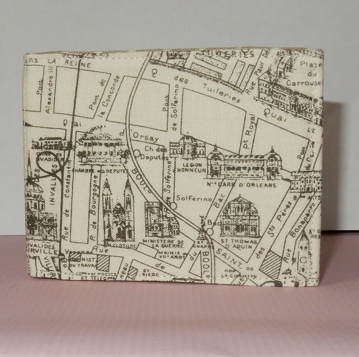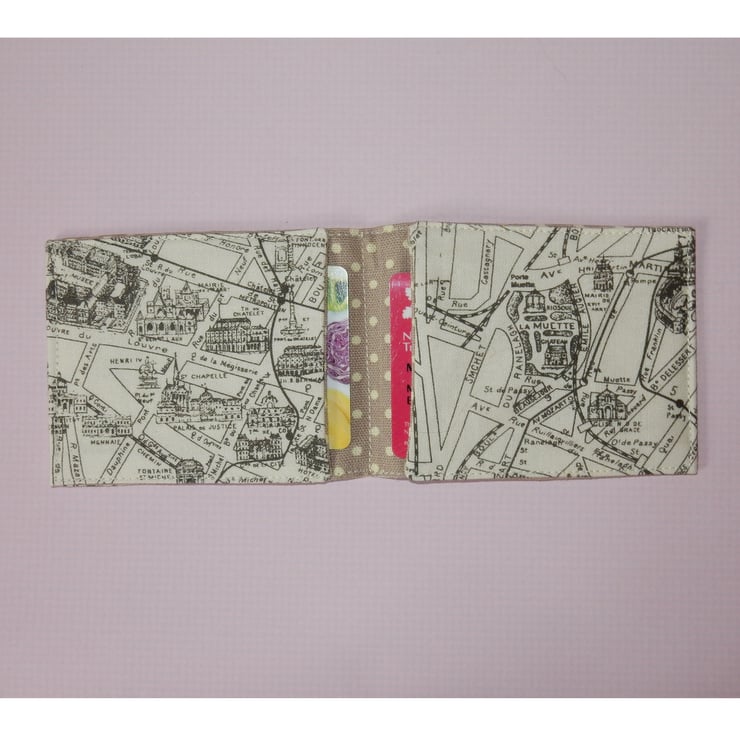 This French themed wallet is great for travel cards, Oyster cards, bus pass or even credit cards. It measures approx. 3.5 x 3 inches folded and 7.5 inches open. It is made with fabric featuring a map of Paris and it is lined in spotted linen effect fabric.