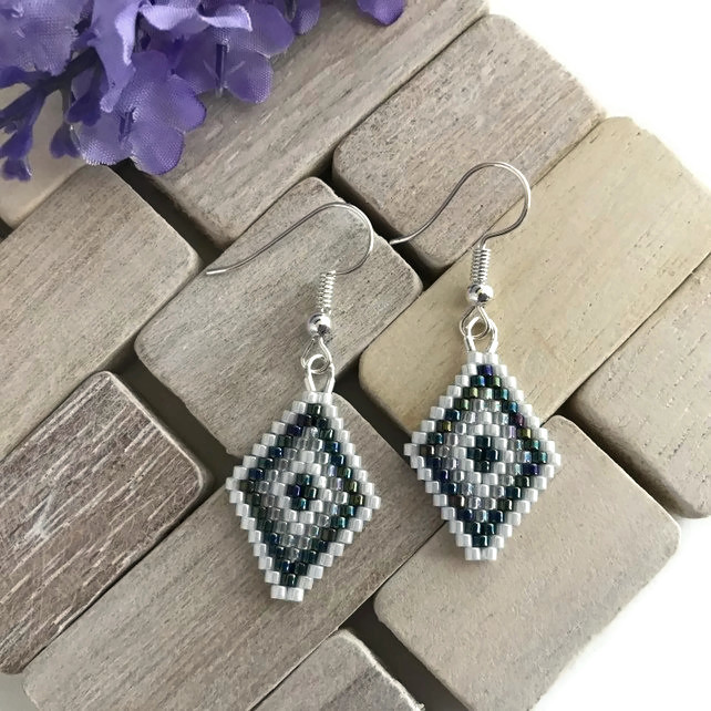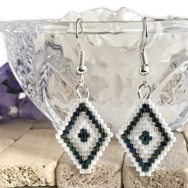 These earrings have been created by handsewing Miyuki delica seed beads in white, clear AB and metallic blue iris into diamond shapes, using the bead weaving technique peyote.