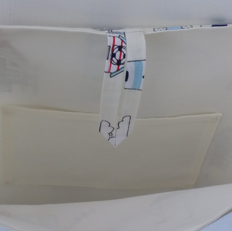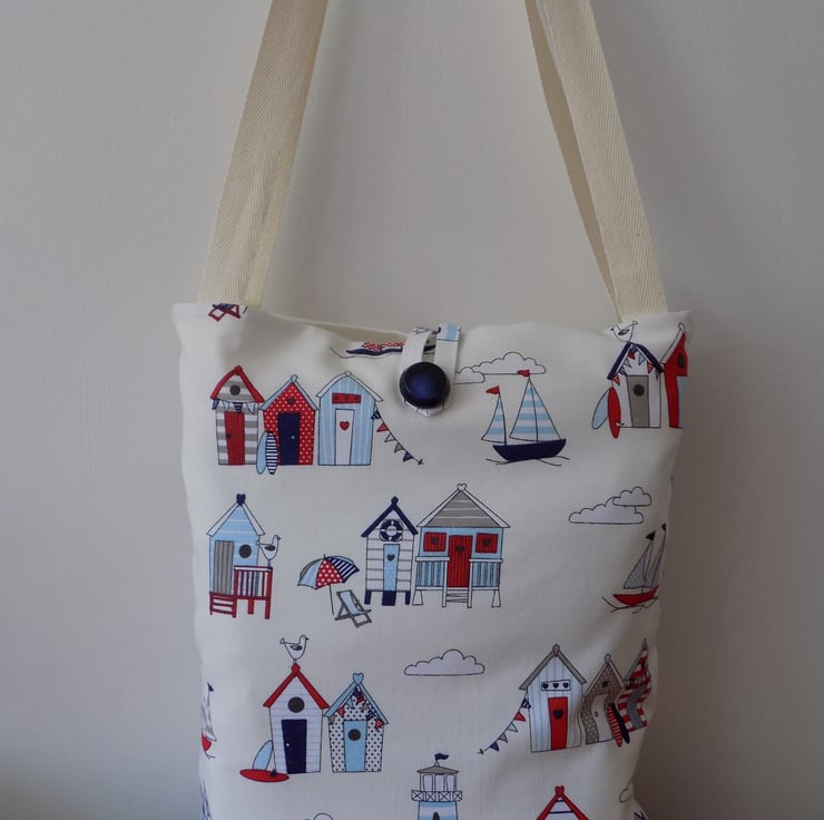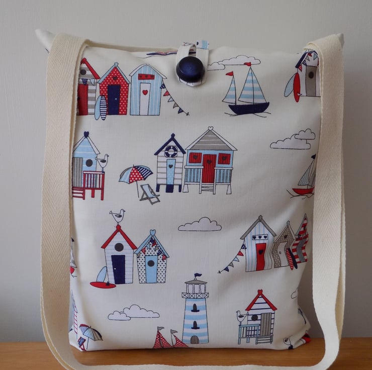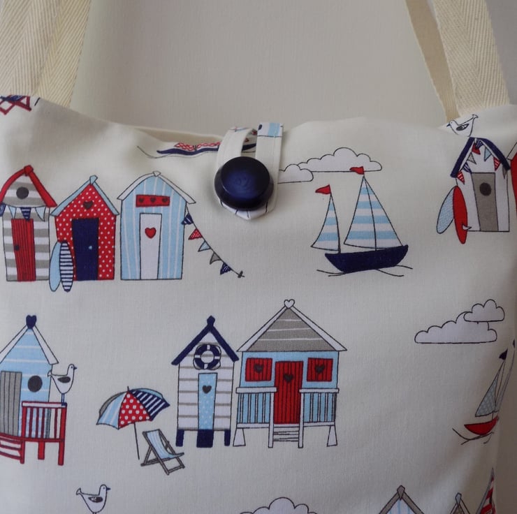 This bag is handmade from a fun fabric featuring red, white & blue beach huts, sailing boats and lighthouses on an off-white background and definitely evokes the feeling of carefree summer days.