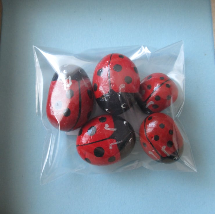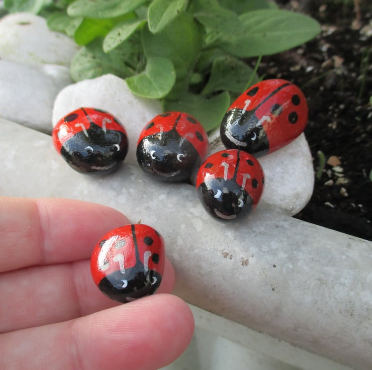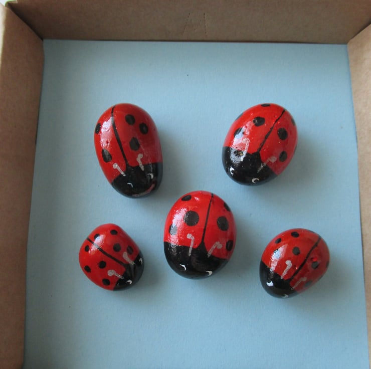 A set of five little ladybirds, hand painted. These wee pebbles have been painted in acrylics, and sealed with outdoor varnish so that they can be used inside or outside.
