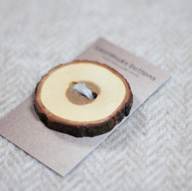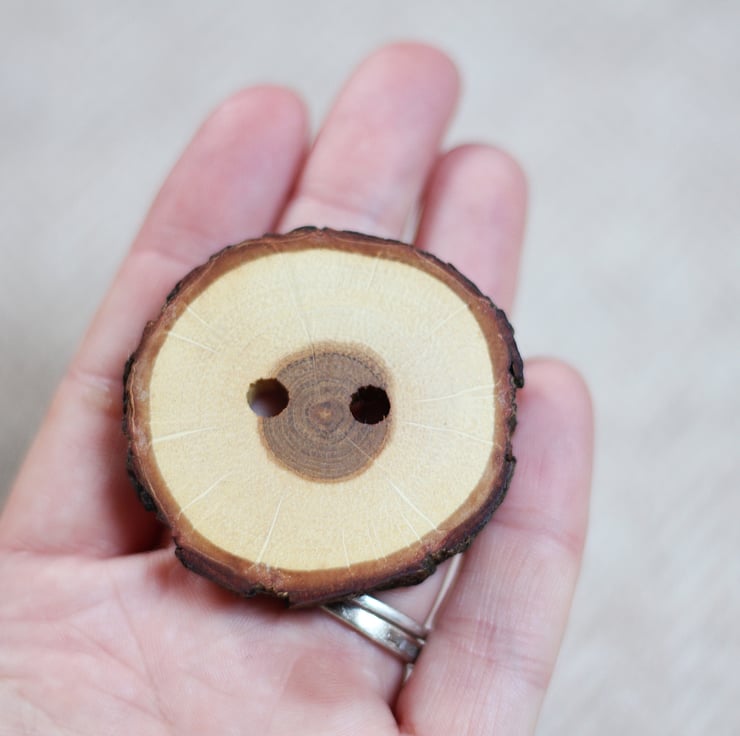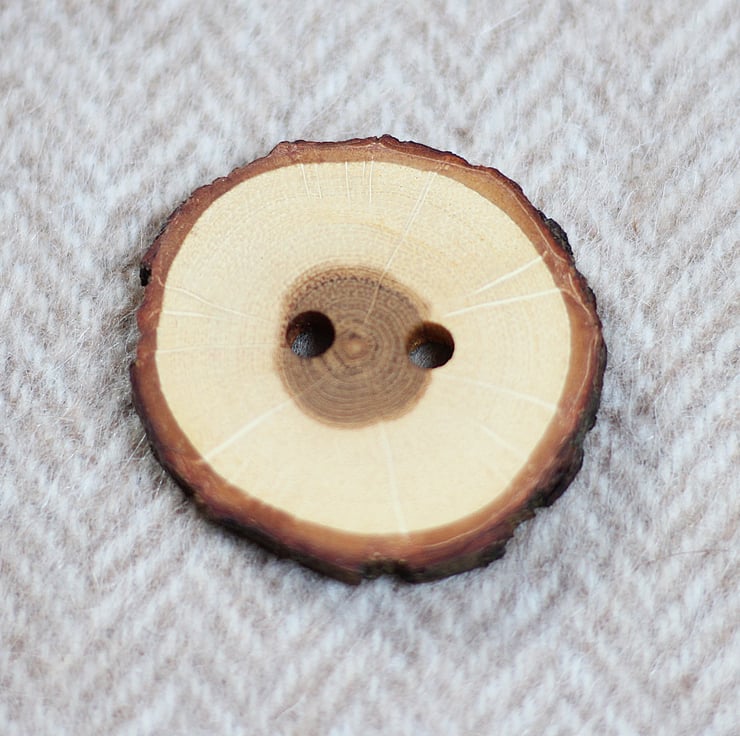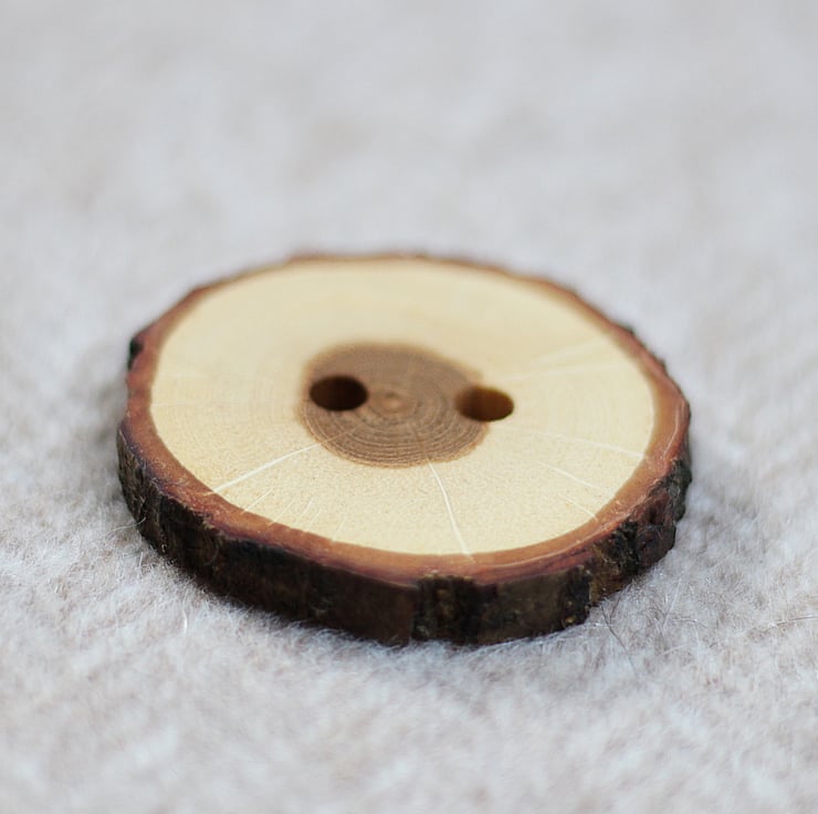 Handcrafted large statement wooden button with bark is made out of reclaimed forest tree branch.