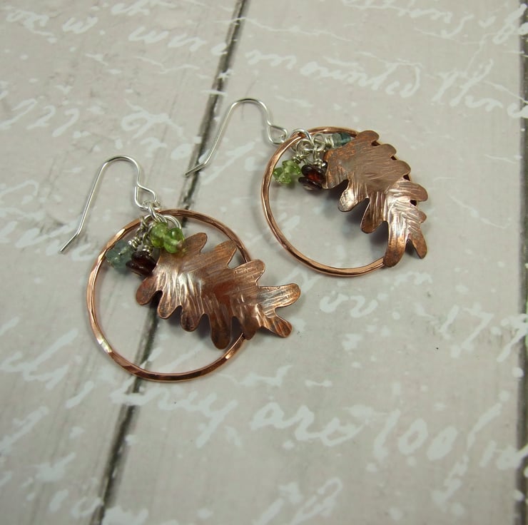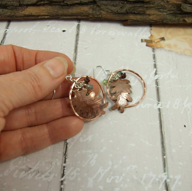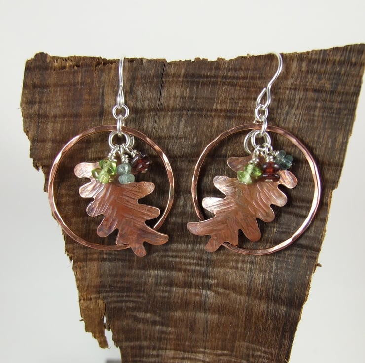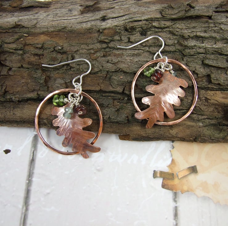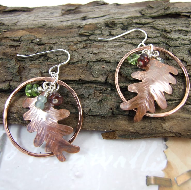 Hand forged copper oak leaf has been cut from copper sheet then sanded, hammered to create a light textured and domed effect and drilled and heat treated to add some colour to the copper. Paired with Copper Wire Hoops and tiny gemstone beads of red garnet, pale blue aquamarine and vibrant green peridot and my own handmade ear wires, alternative studs or small hoops are available, please note in comments at checkout if you would prefer alternative fittings.