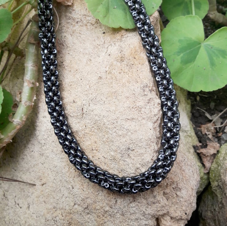 Handmade rope necklace created using beadweaving techniques with needle and specialist beading thread. The metallic grey beads are czech twin hole glass beads that helps to produce this wonderful tactile fabric rope necklace. It looks very similar to the gemstone hematite.