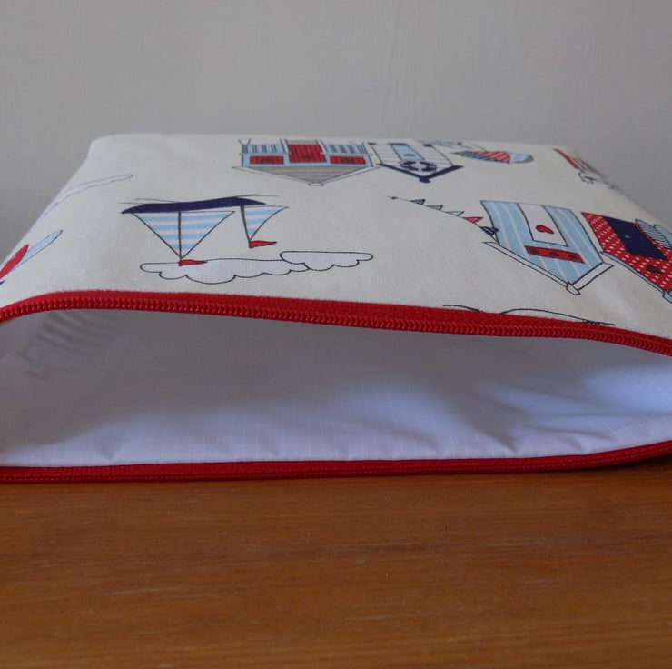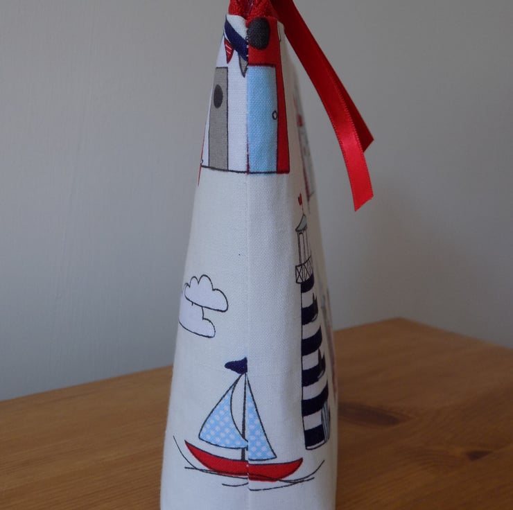 It is made from a delightful, high quality 100% cotton fabric, featuring red, blue and white beach huts, sailing boats and lighthouses on an off-white background. It definitely evokes the feeling of carefree summer days!