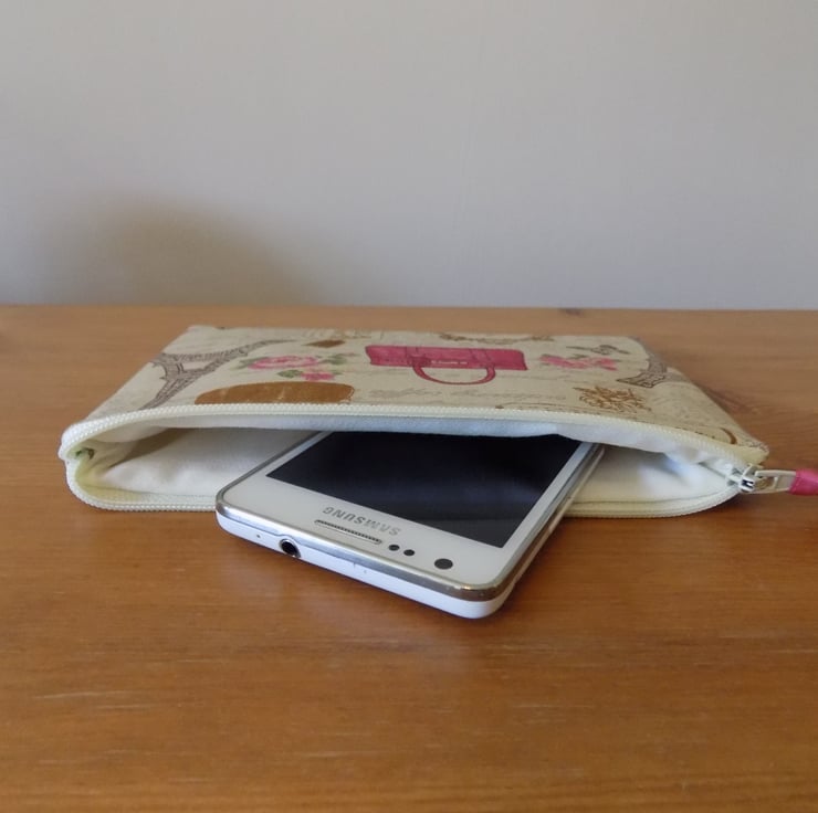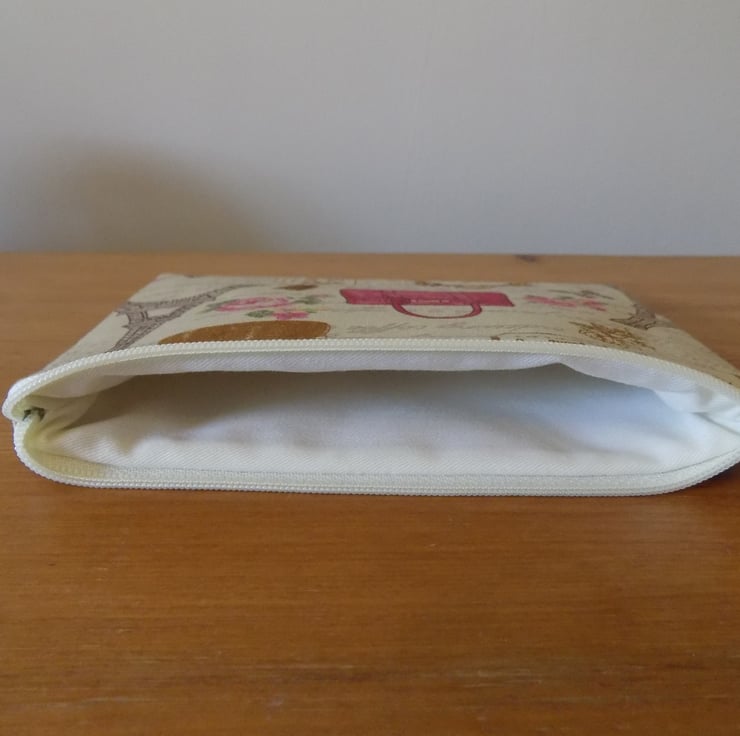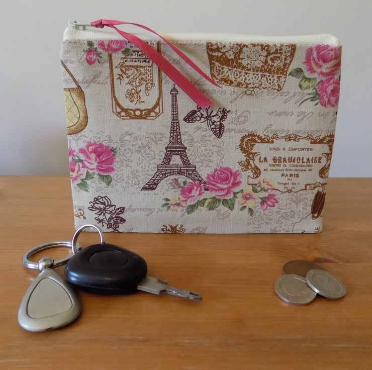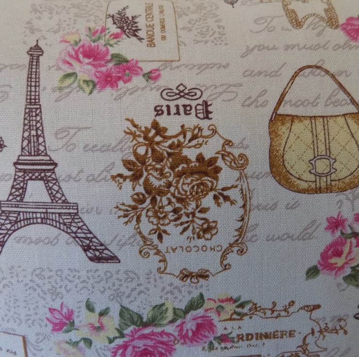It is made from made from a lovely quality soft cotton canvas fabric by Rose & Hubble. The fabric features a montage of Eiffel Towers, pink roses, handbags and signs on a light beige background and definitely has a vintage feel about it!