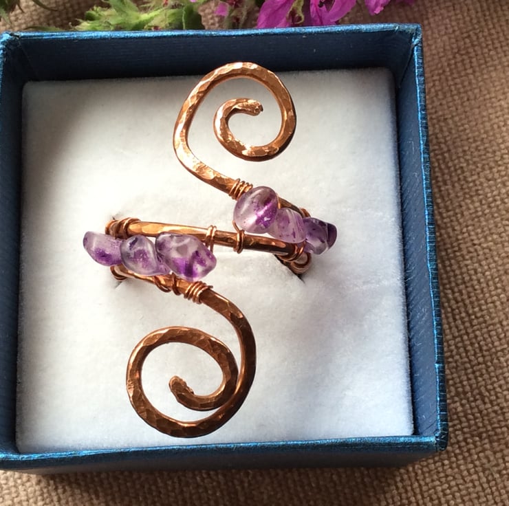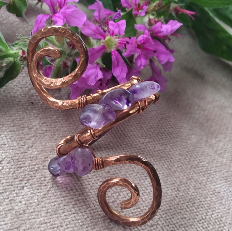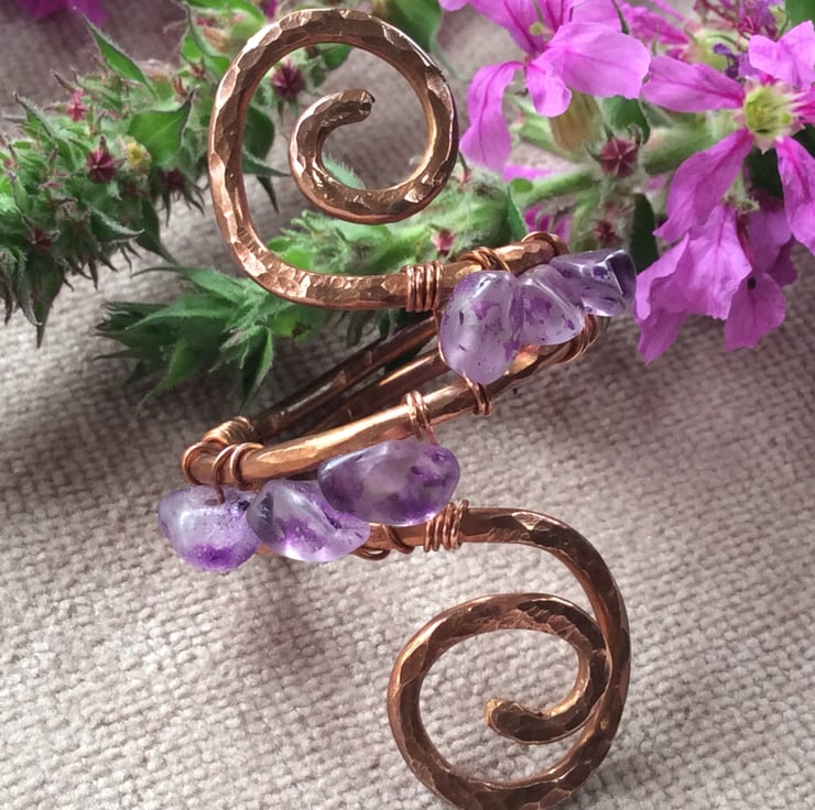 Curly, swirly, twisted and hammered 2mm copper wire, wrapped with SIX amethyst chips.