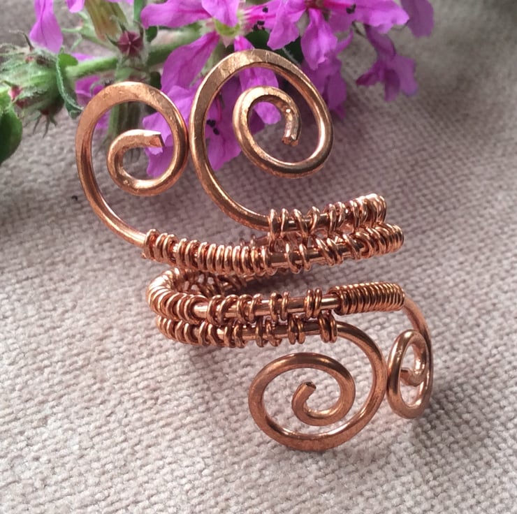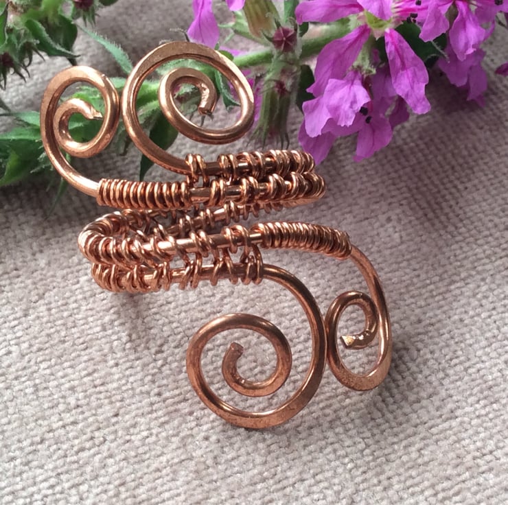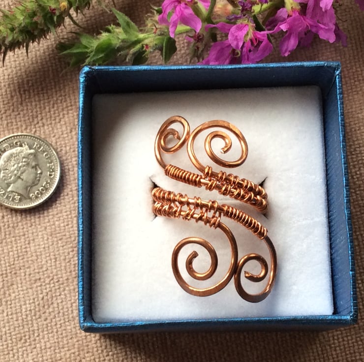A classic, curly swirly, twisted, wrapped and hammered 2mm upcycled copper wire ring.