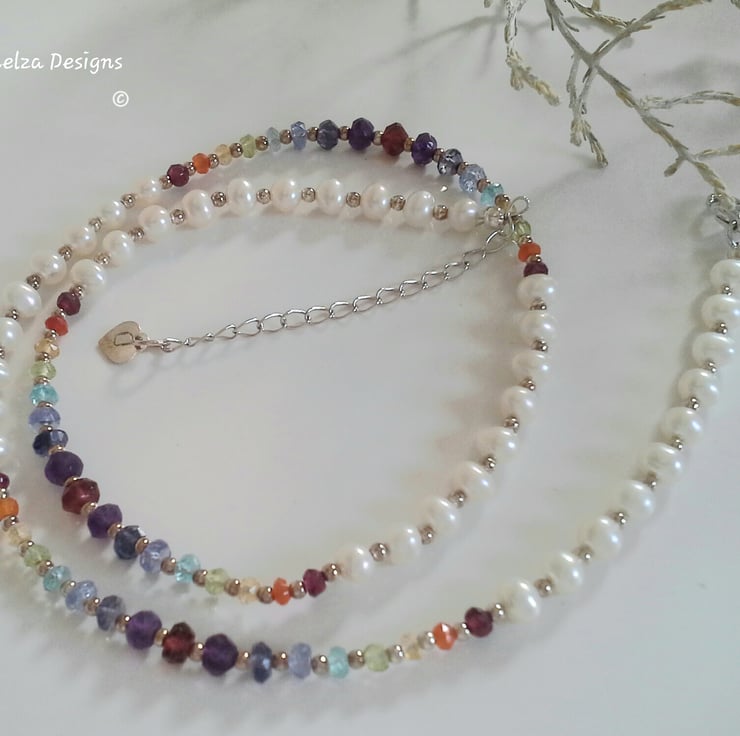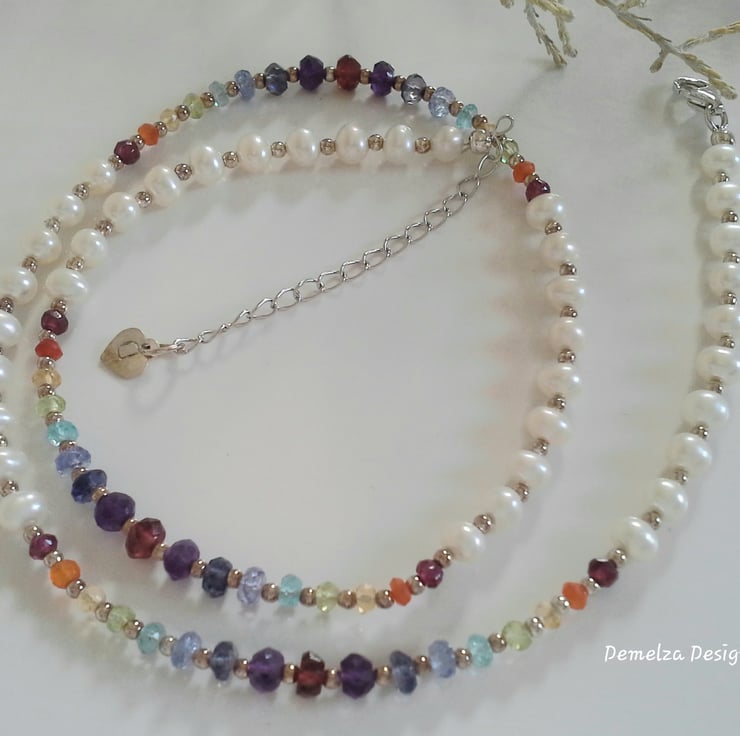 An absolutely beautiful necklace which oozes individuality, luxury and class for the lady whom only wears and purchases the best things in life. The necklace has been designed and hand made using quality dainty looking ivory white freshwater culture pearls with faceted multi gemstones which graduate in size within in each station consisting of tanzanite, carnelian, Indian red garnet rhodolite garnet, , amethyst, citrine, apatite, peridot and iiloite. For the main construction coated stainless steel jewellers wire has been used for added strength and lasting durability, finished off with tiny sterling silver spacer beads, extender chain, silver heart and clasp.