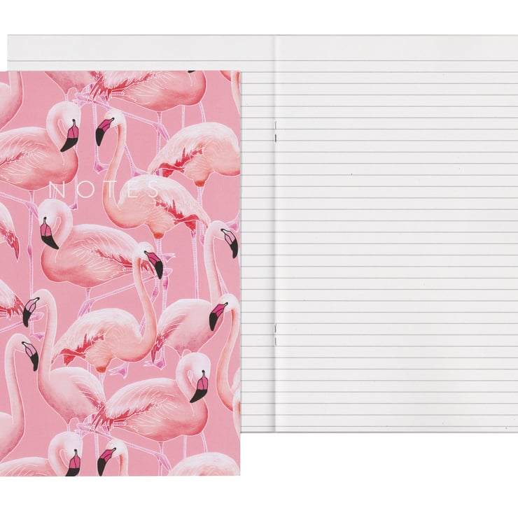An A5 notebook with lined pages. The cover features a fun hand drawn pattern of a flamboyance of flamingos.