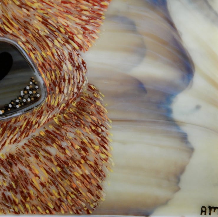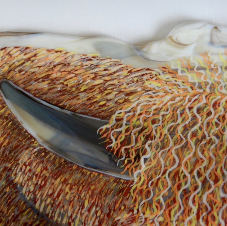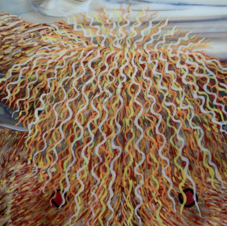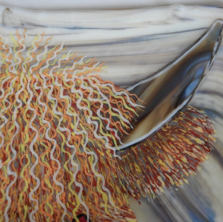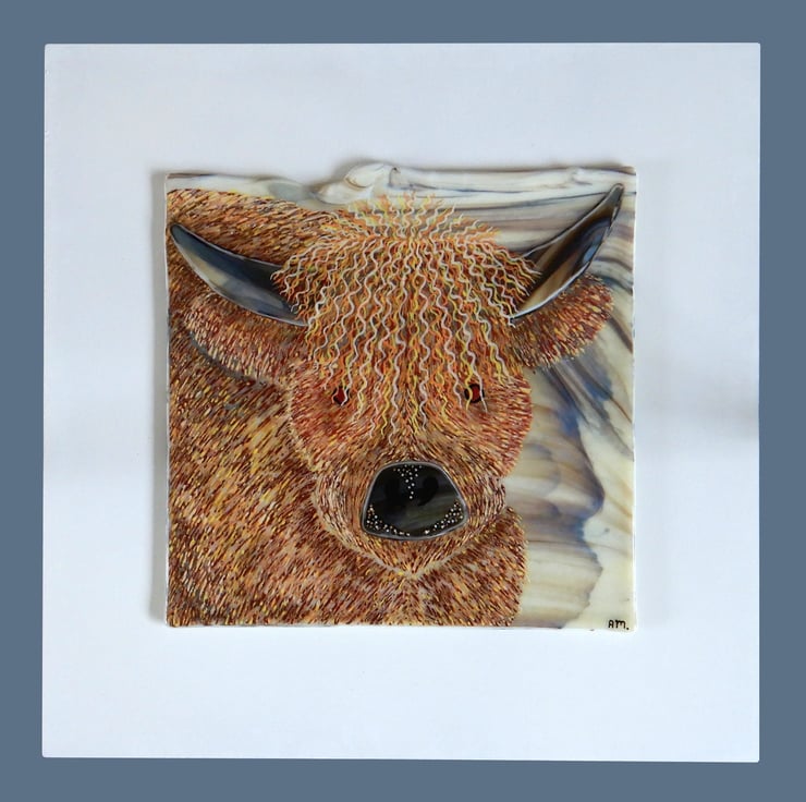 'HAMISH THE COO' was made by multi-layering glass-line glass over a sheet of wispy Autumn coloured glass. The texture and details of the cow were then made by scraping through the glass-line. The eyes are metallic dichroic glass and the snout and horns are cut wispy brown glass. Once complete the picture was then fused in my glass kiln. This picture took three firings to allow me to multi-layer the colours and get it just right!