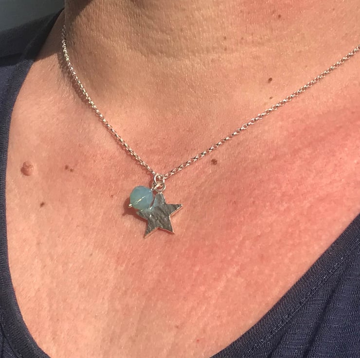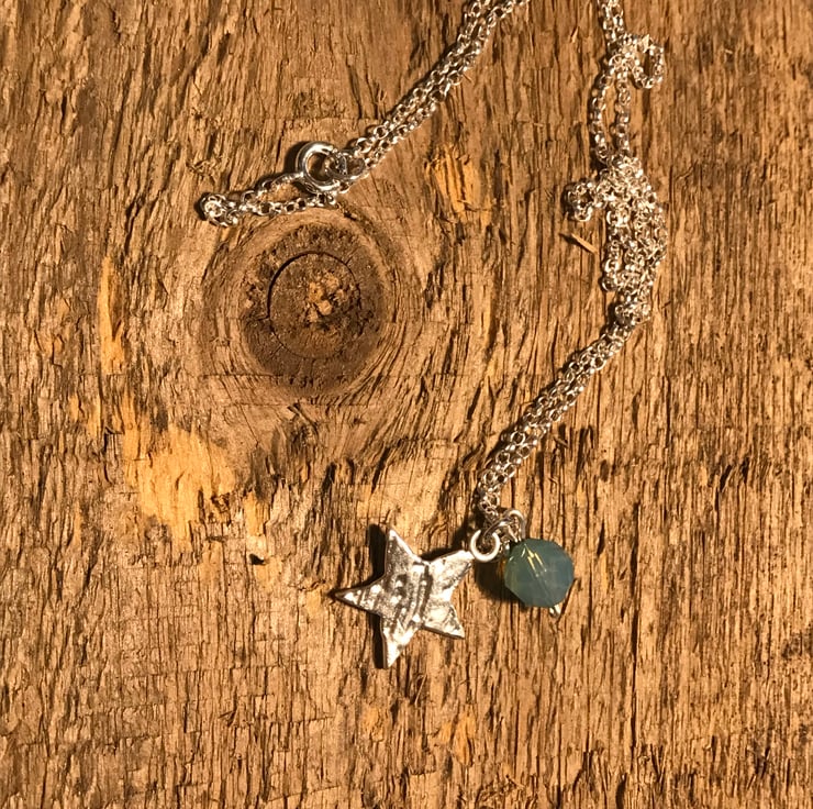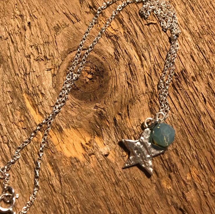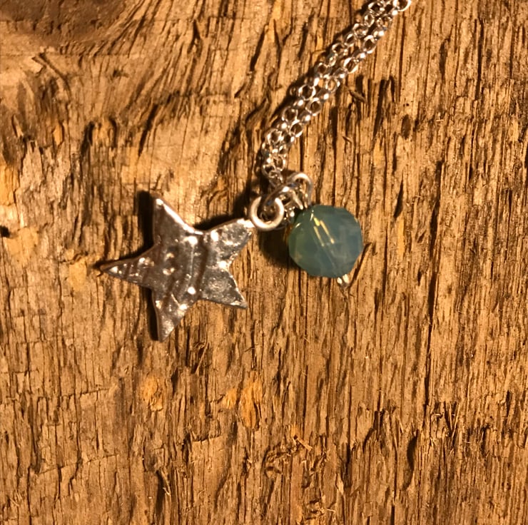 Precious metal clay silver star with textured detailing and blue bead. Chain and all findings sterling silver.