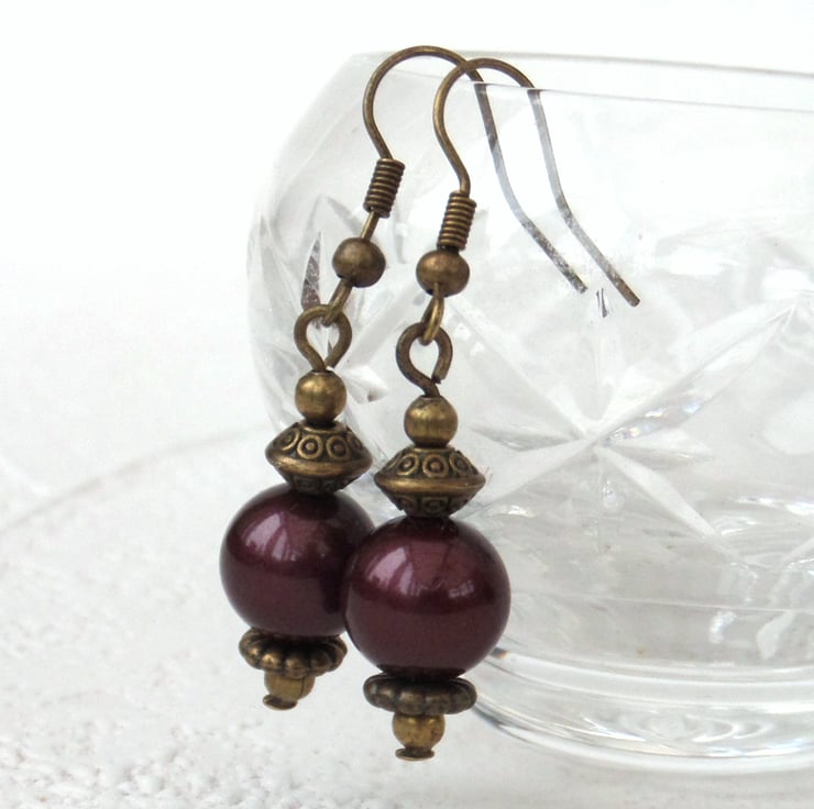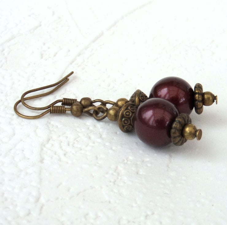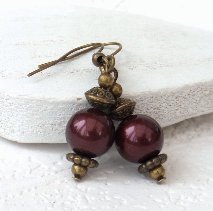 A beautiful pair of handmade earrings with bronze and shell pearls, the colour of which is best described as burgundy - brown!