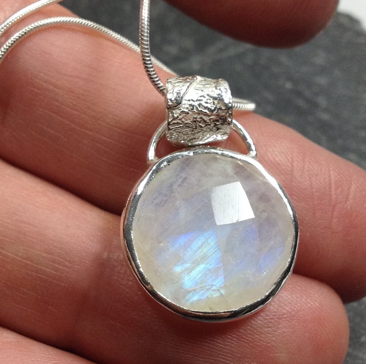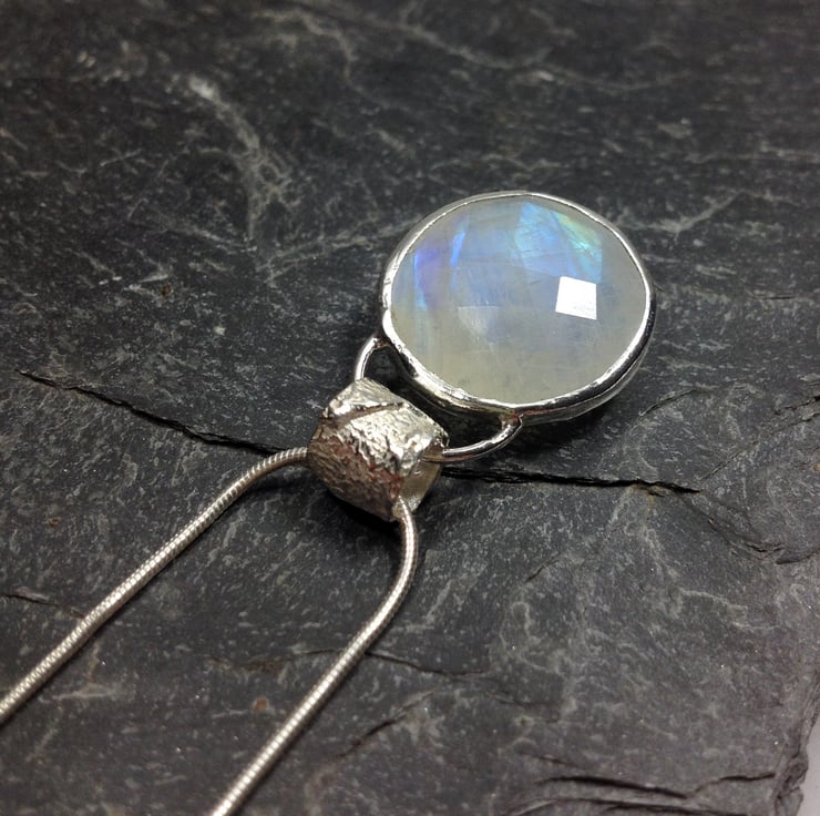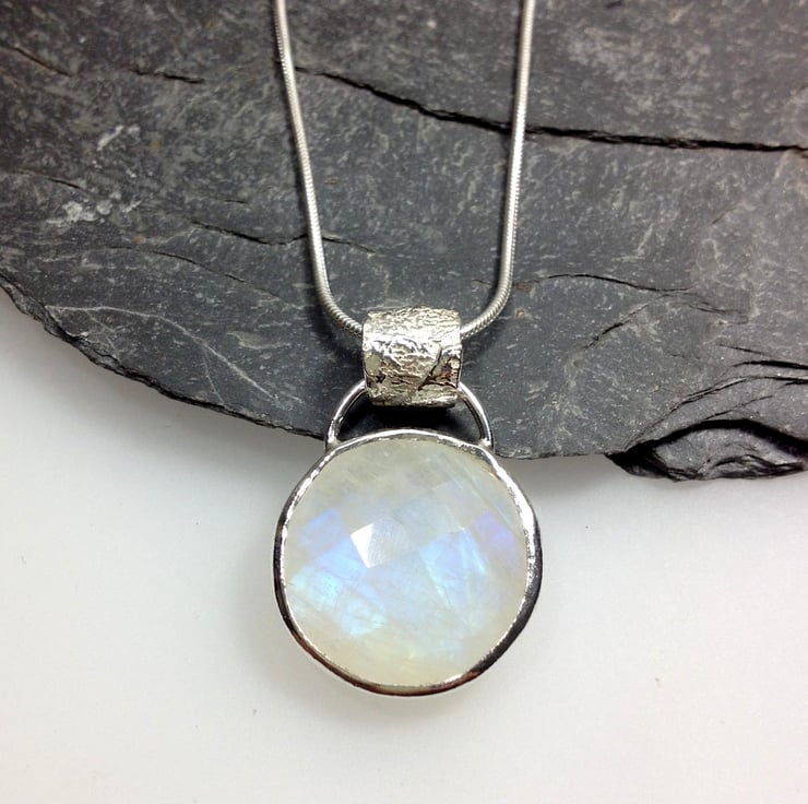 Circular faceted rainbow moonstone pendant on sterling silver snake chain.