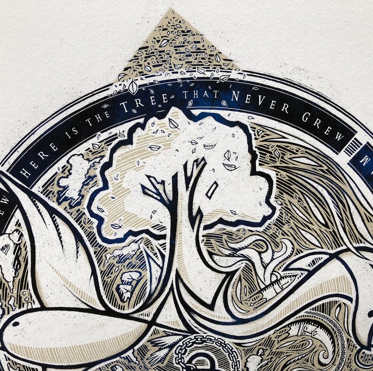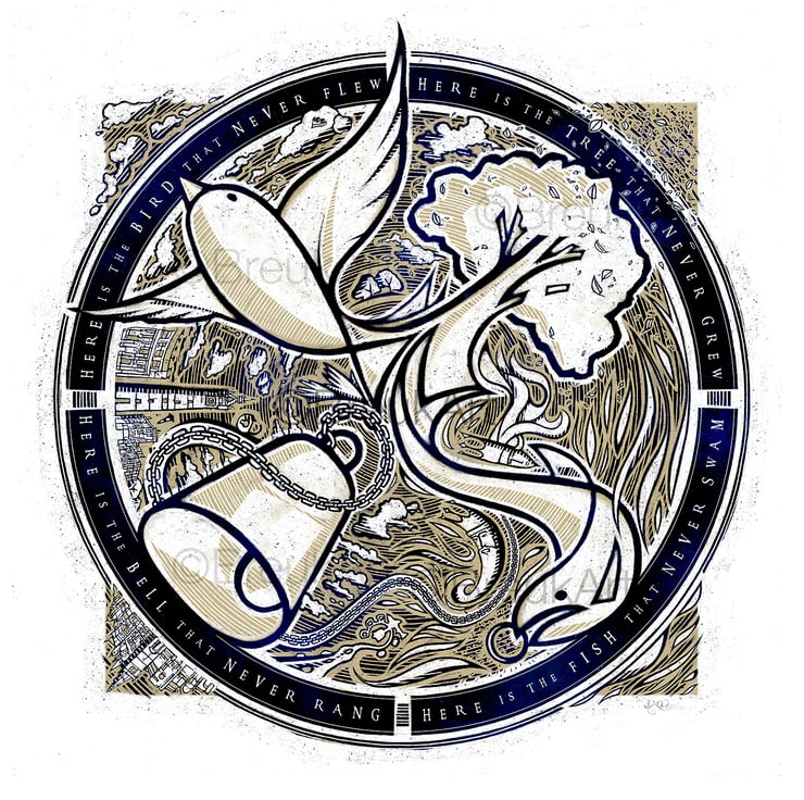 Illustrated to achieve a linocut effect, the grooves spiral to ever decreasing circles, creating movement and connection to the flying bird, the blooming tree, the sounding bell and the darting fish.