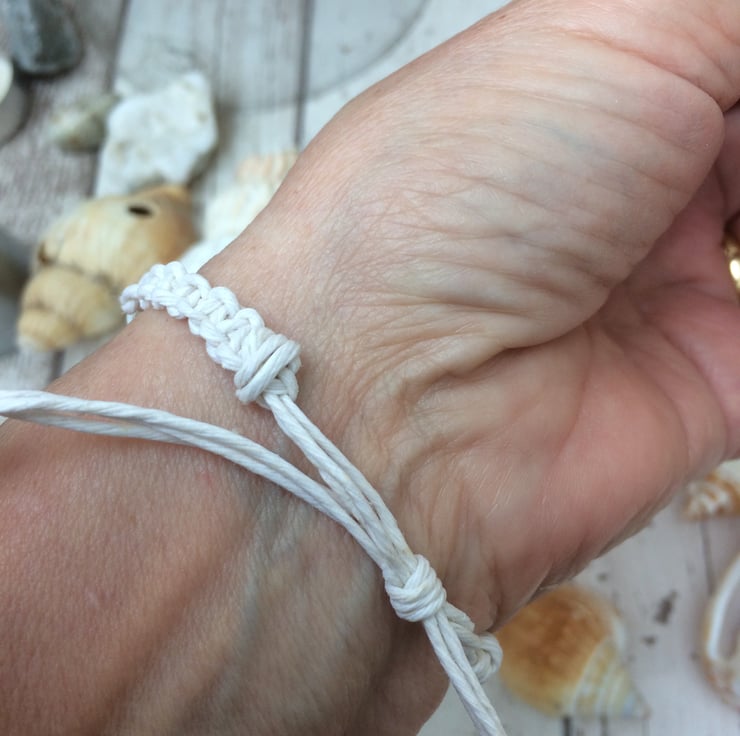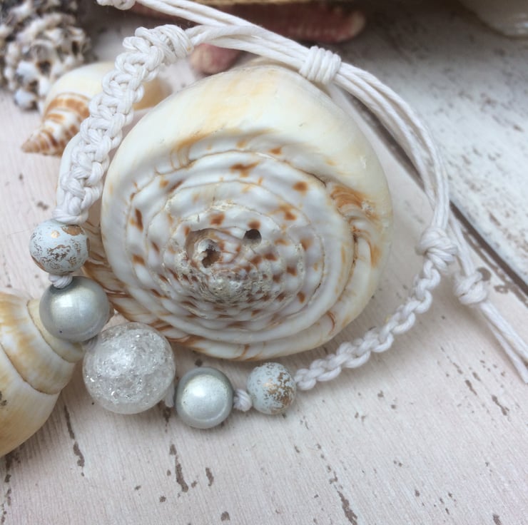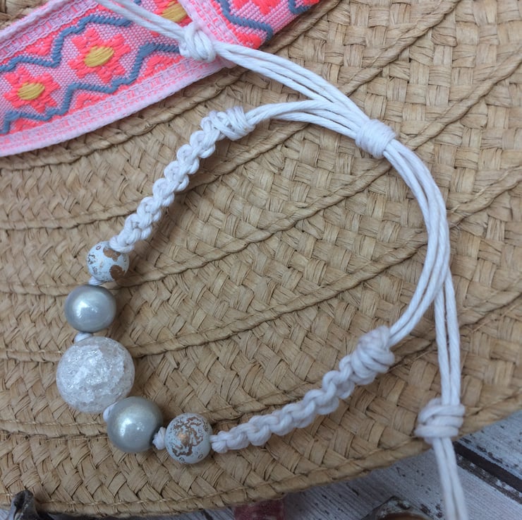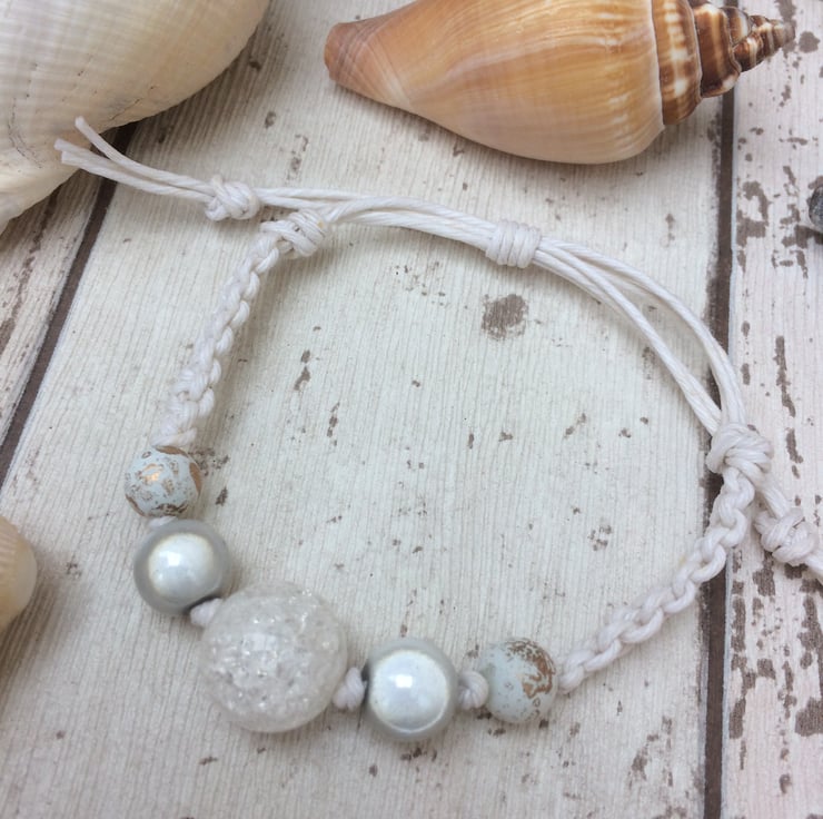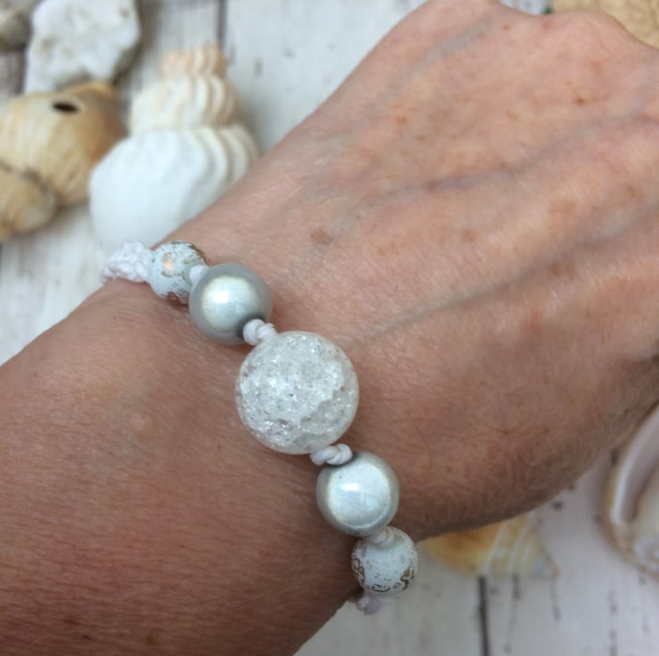 Crackled quartz beaded macrame bracelet with white hemp cord.