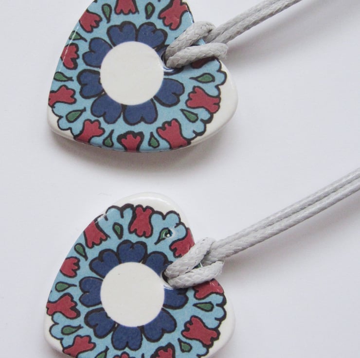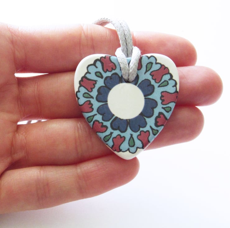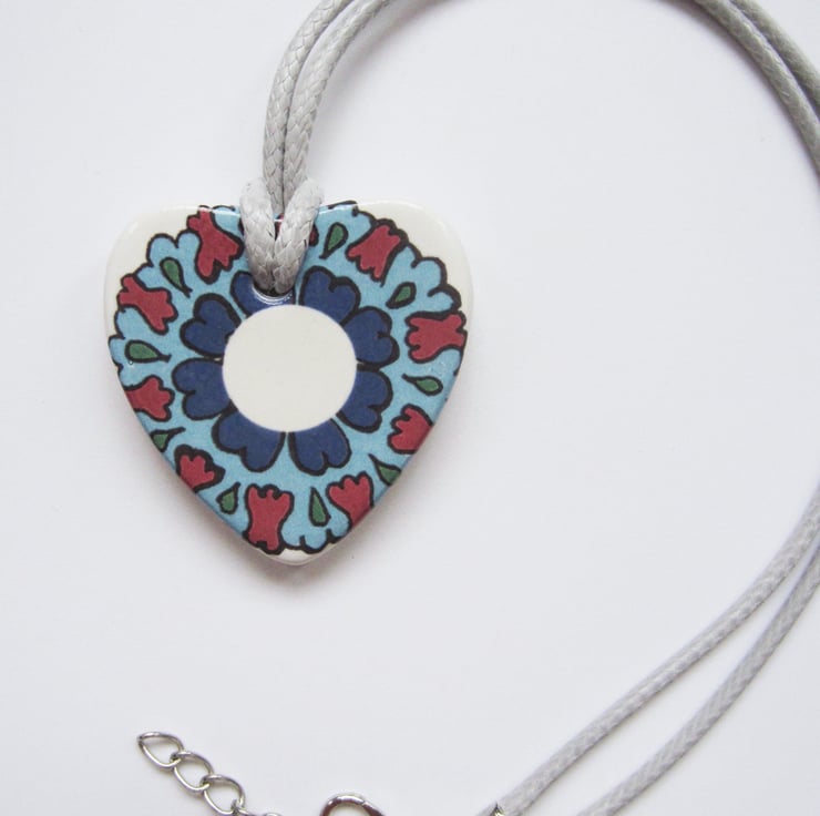 Ottoman Inspired Floral Design Heart Shaped Ceramic Pendant on 38 - 43cm or 15 - 17 inch Light Grey Cord with Lobster Clasp and Extender Chain