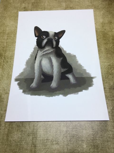 A lovely French Bulldog post card by DuffleCat Prints (Damian Case). Front of card with design on is Gloss coated. Back of card is blank and uncoated for your message. 127mm x 177.8mm. 330gsm card stock. Portrait.