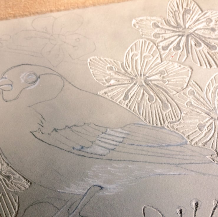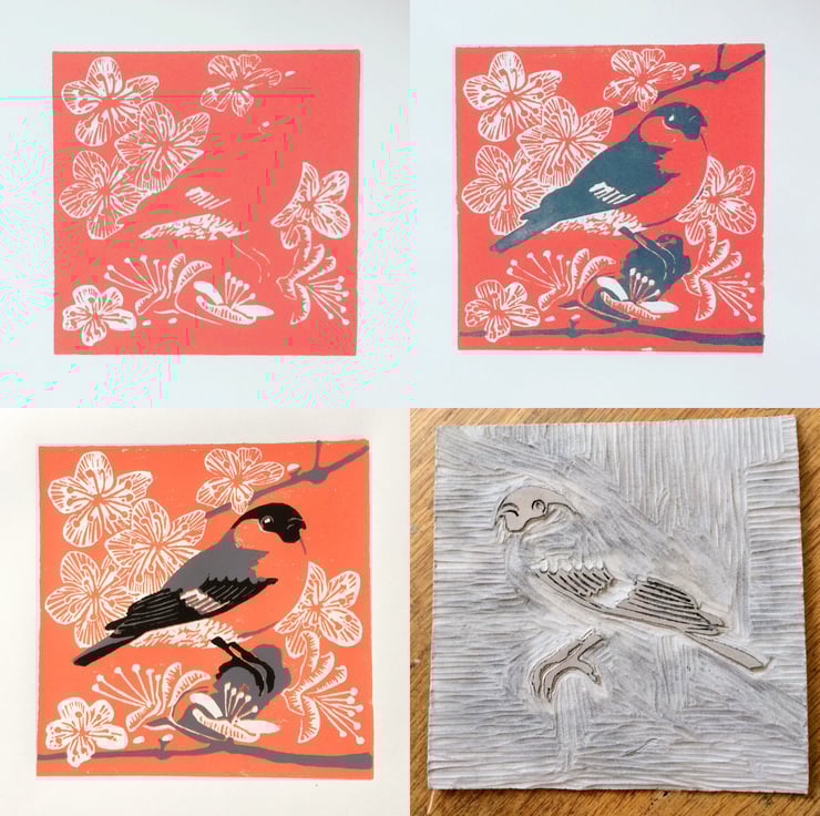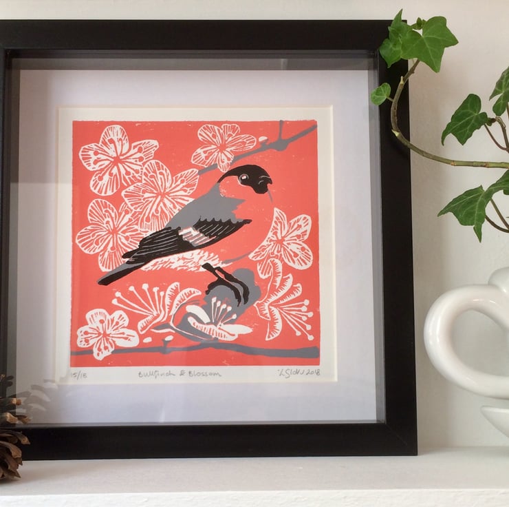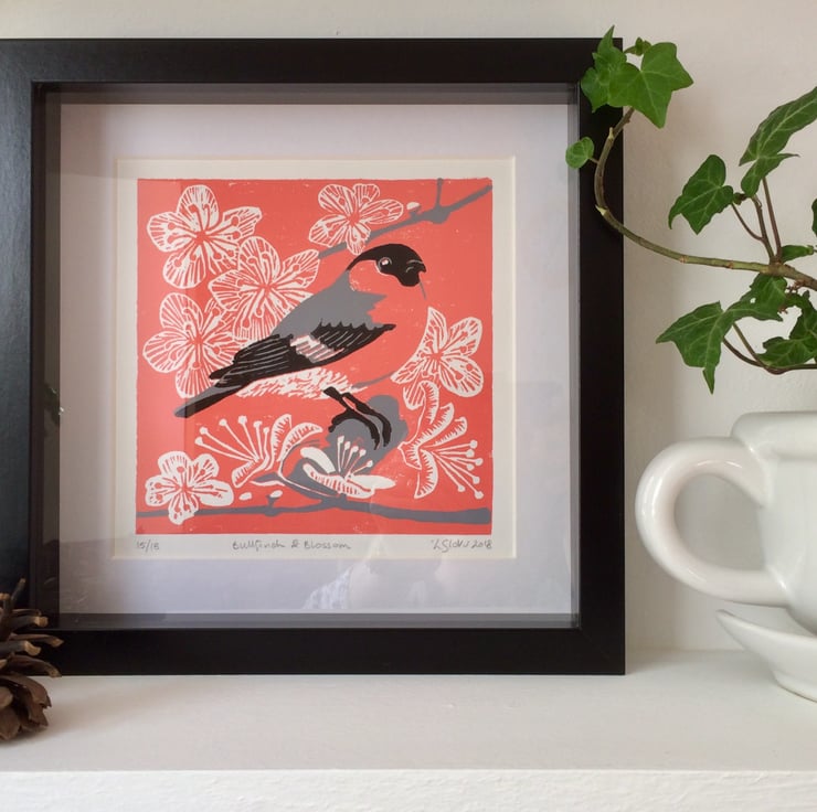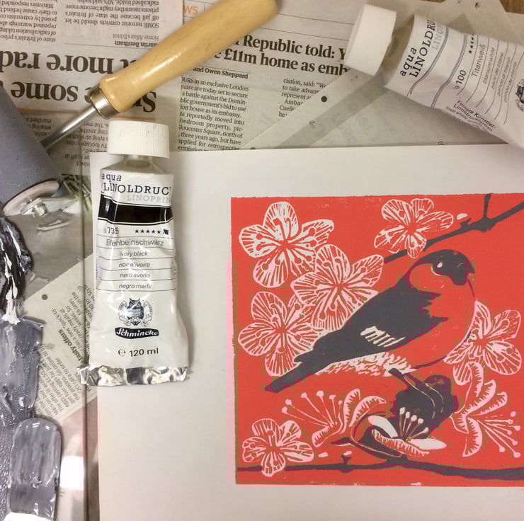 A three colour reduction linocut print featuring a bullfinch in a blossom tree.