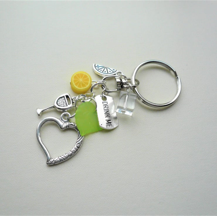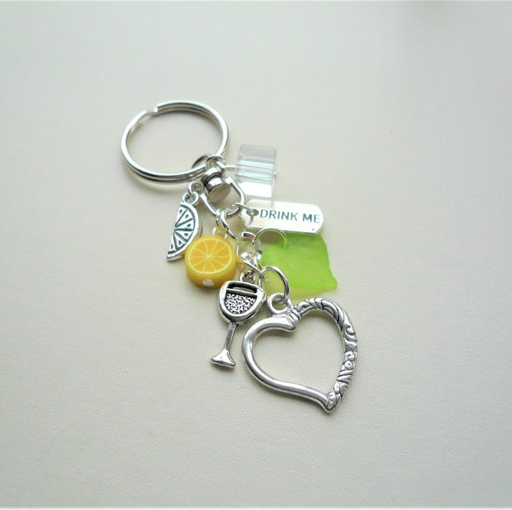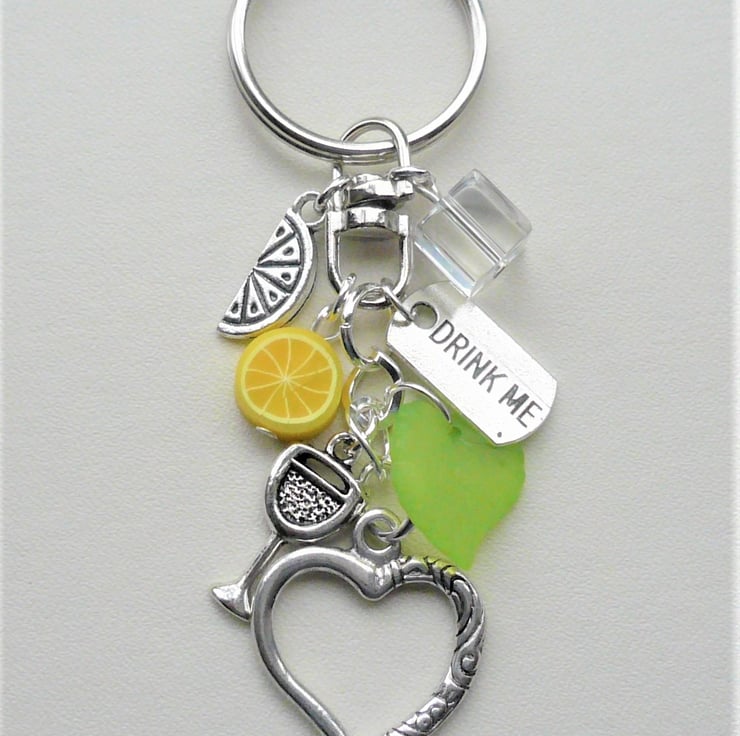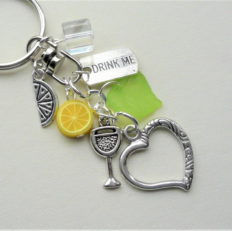 Fun Gin and Tonic themed keyring or handbag charm made up of 10mm round polymer clay lemon slice bead, 8mm clear glass 'ice' cube and 15mm green lucite leaf, all teamed with Tibetan silver charms - glass, 'Drink Me' tag and lemon wedge, with heart pendant hanging below. All attached to 25mm silver plated swivel keyring and chain and measures approx 8.5cm incl ring.