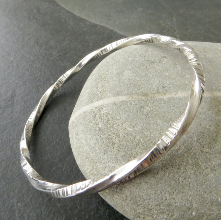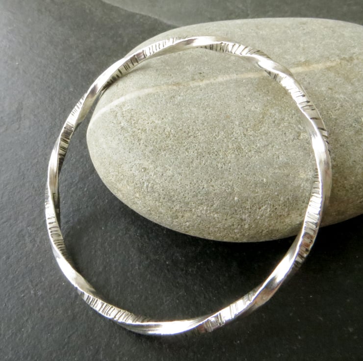 This unusual silver bangle has been made from thick square profile sterling silver wire. I've textured two opposite sides with a sharp line texture and then twisted the wire along it's length before forming it into the bangle shape and soldering the ends.