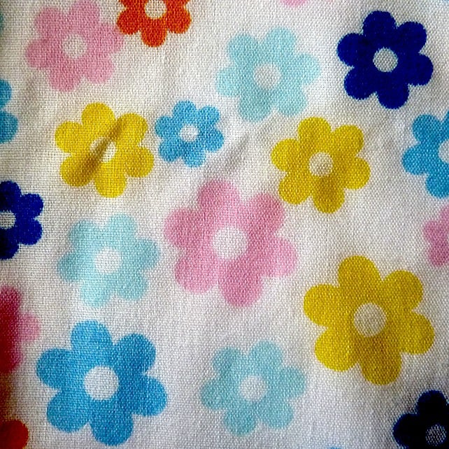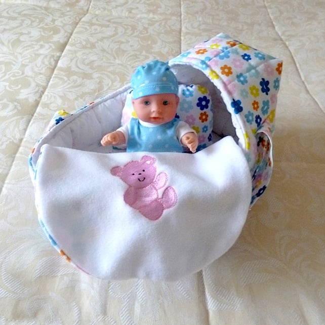 This colourful doll's carrycot is made from polyester cotton fabric which has a multi coloured flower design