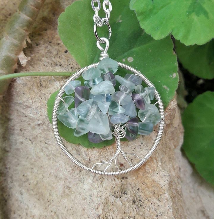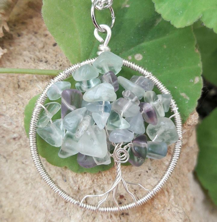 Handmade Wirewrapped tree of life with Fluorite Gemstone Chips. The first stage of the process is to make the circle, using a thick wire that is shaped around a wooden mandrel. The wire is then cut, wrapped at the top and hammered to work harden the wire (using a nylon tipped hammer).