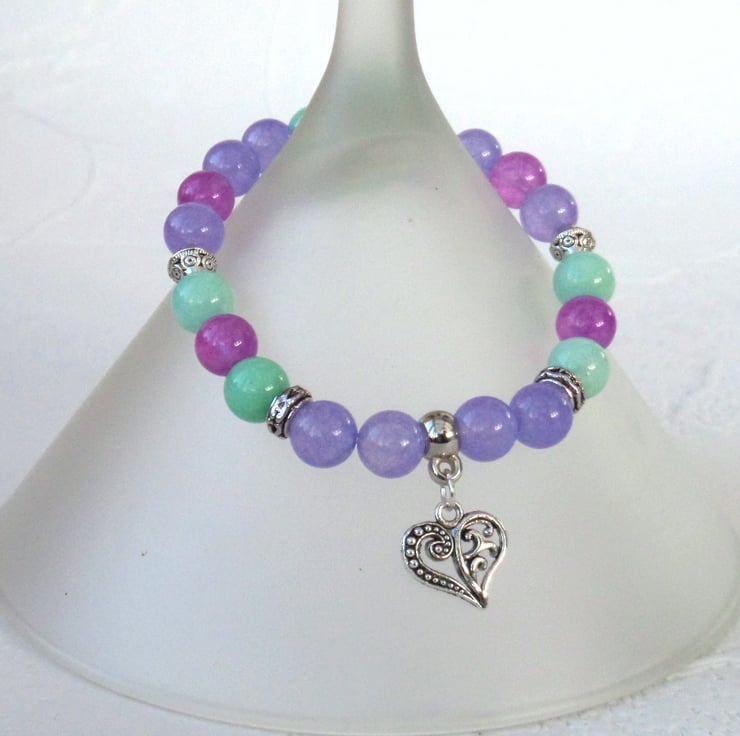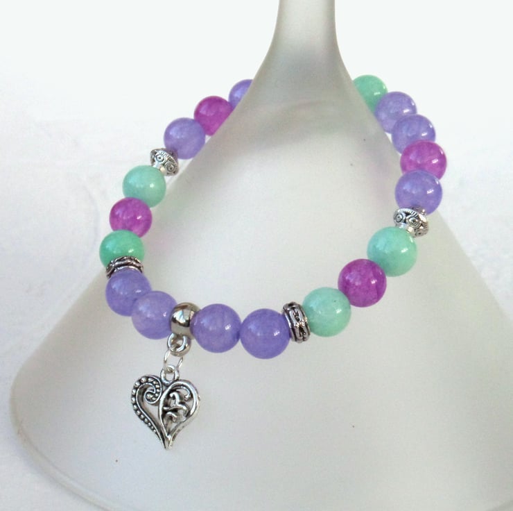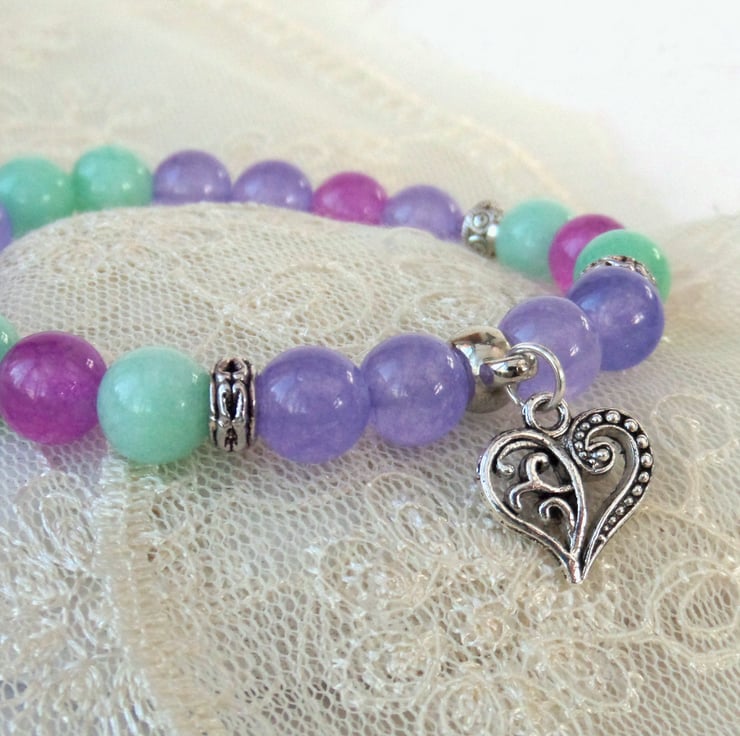 A stunning handmade bracelet in lovely pastel summer colours - purple, pink and pale turquoise, with some silver coloured beads separating them and adding additional uniqueness to this bracelet.