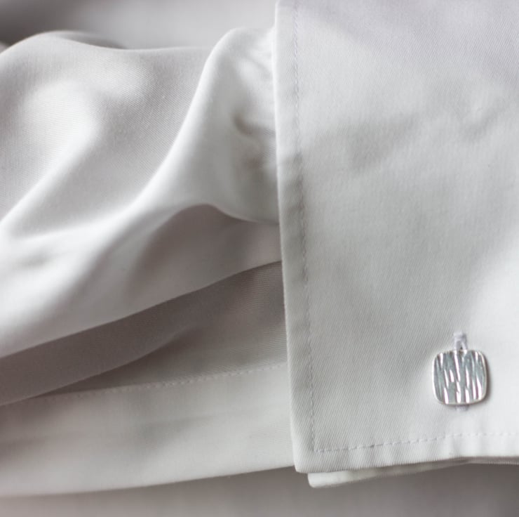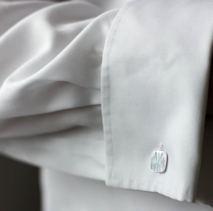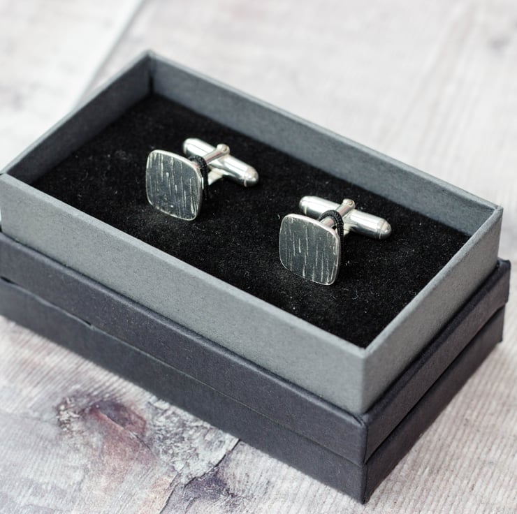 These square cufflinks have been hammered to give a striking bark texture. They have attractive rounded corners and Sterling silver U arm backs.