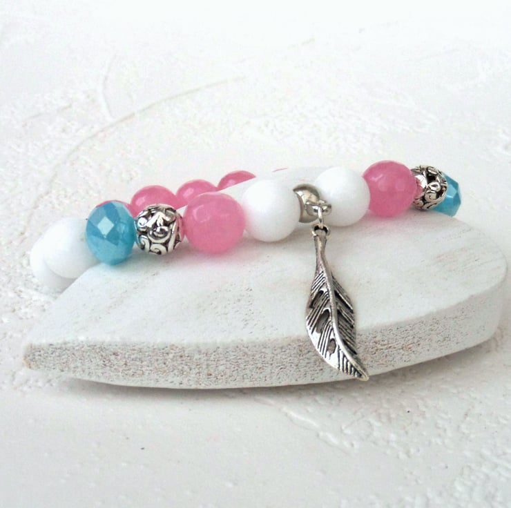 The bracelet has been completed by the addition of a dainty silver coloured feather charm that hangs from a charm carrier. The feather charm is approximately 3.8 cms long.