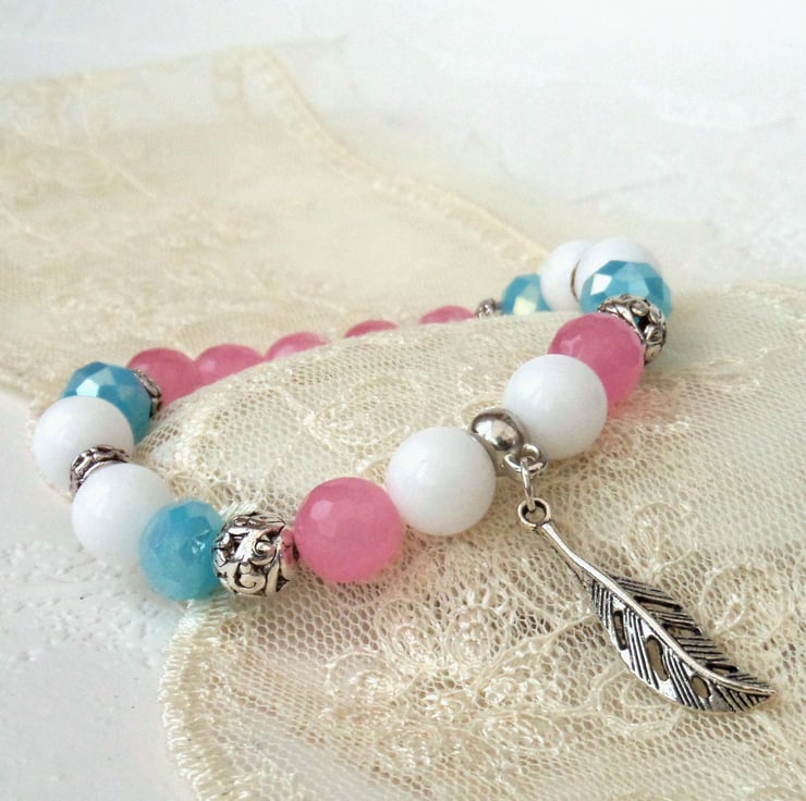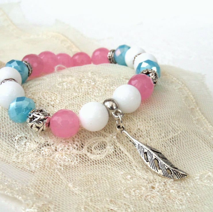 A stunning handmade bracelet in pastel summer colours - sea blue, pink and white, and some silver coloured beads separating them and adding additional uniqueness to this bracelet.