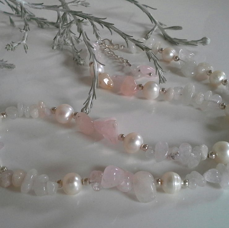 A lovely chic necklace designed and created using quality rare morganite small tumbled nuggets with irregular shaped graduating in size morganite drops, complimented with genuine white freshwater pearls. Either side of the pearls are small 925 sterling silver beads to add a touch of sparkle during wear around the neckline. For the main construction coated professional stainless steel jewellers wire has been used for added strength and lasting durability, finished off with a 925 sterling silver clasp and extender chain.