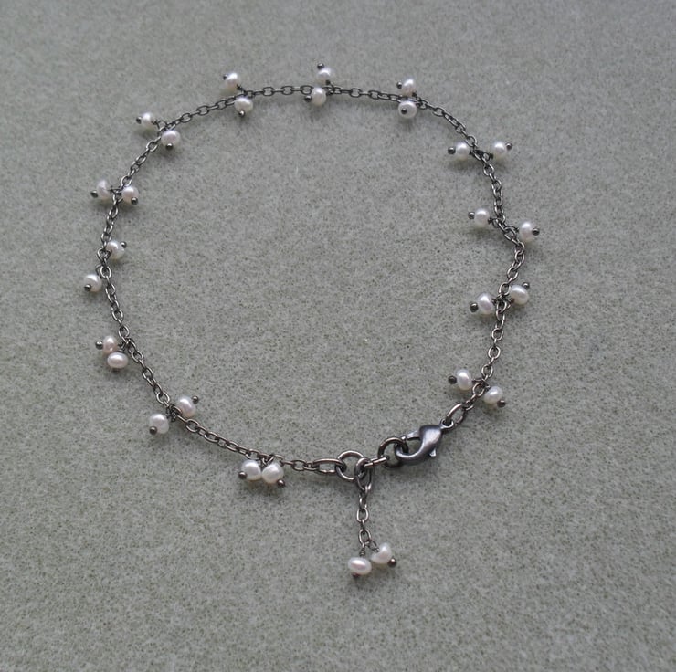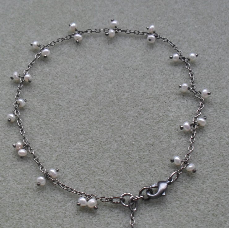 This anklet has been made with black plated chain which has tiny freshwater pearls attached