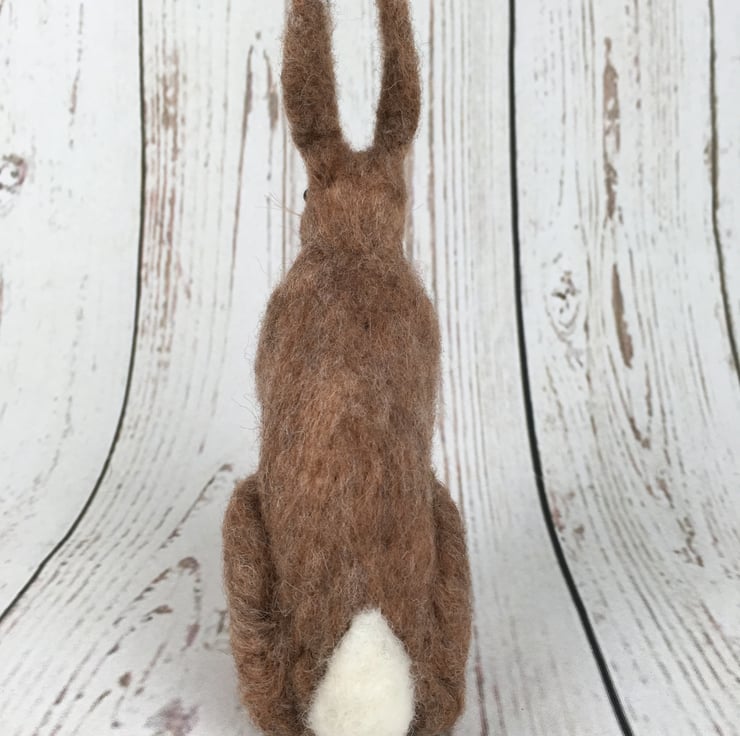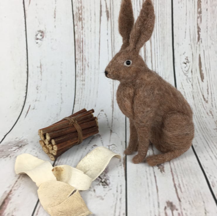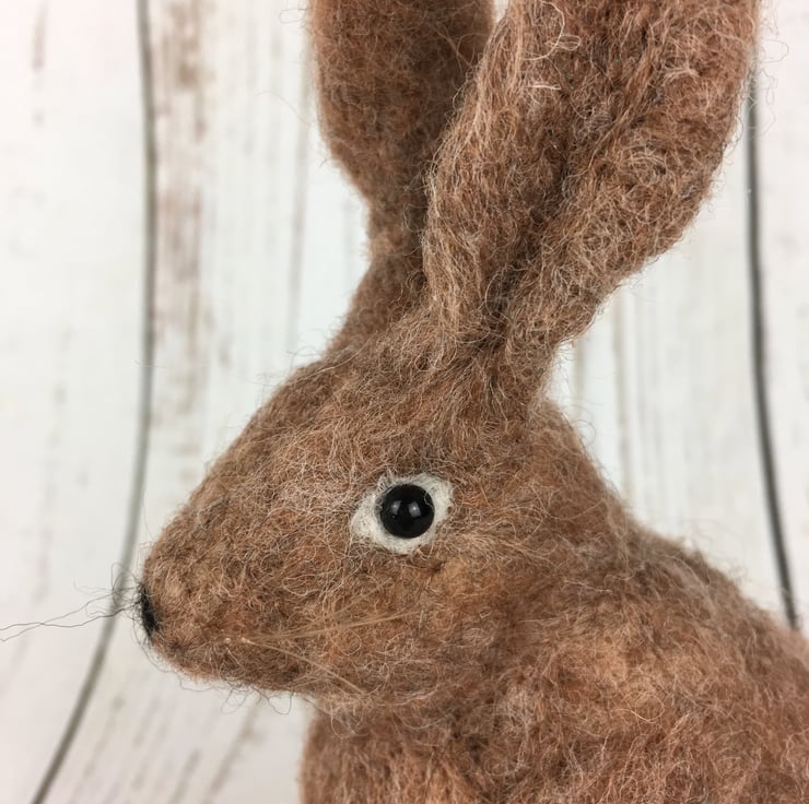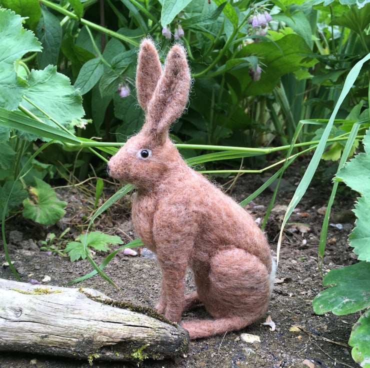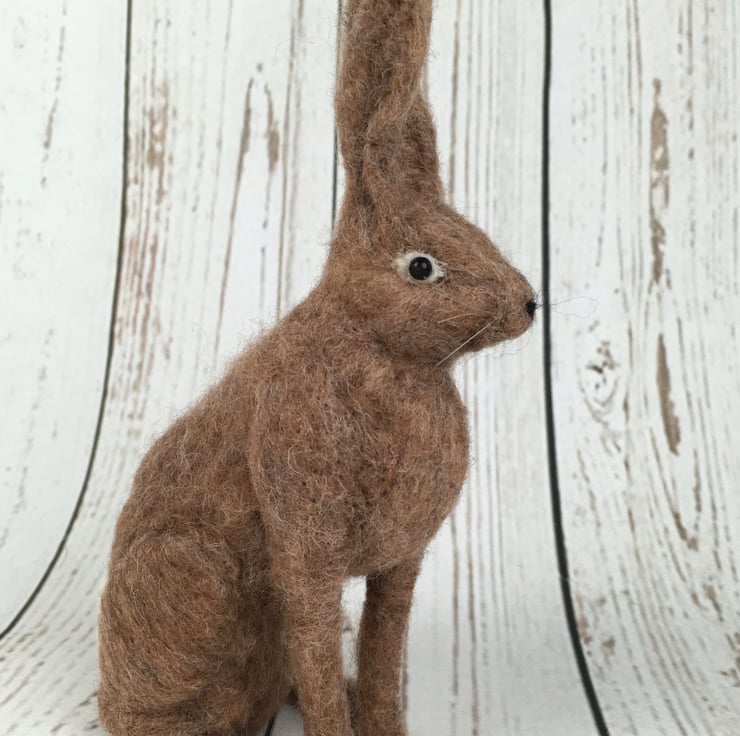 This fabulous brown hare has been sculpted using woollen fibres and a barbed needle using a process known as needle felting. The action of the felting needle causes the fibres to mesh together and bind tightly allowing any shape to be formed dependent on the placement of the fibre and the degree of needling.