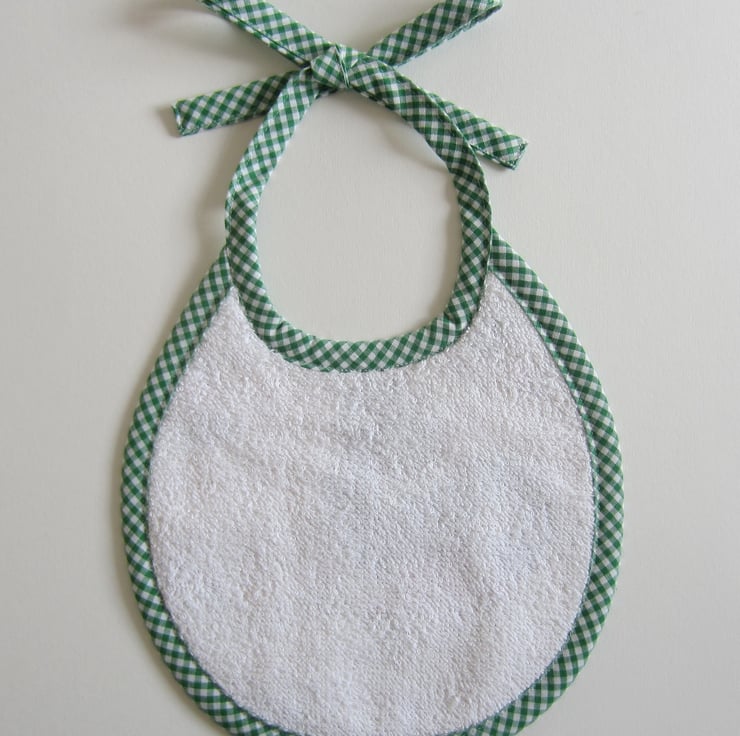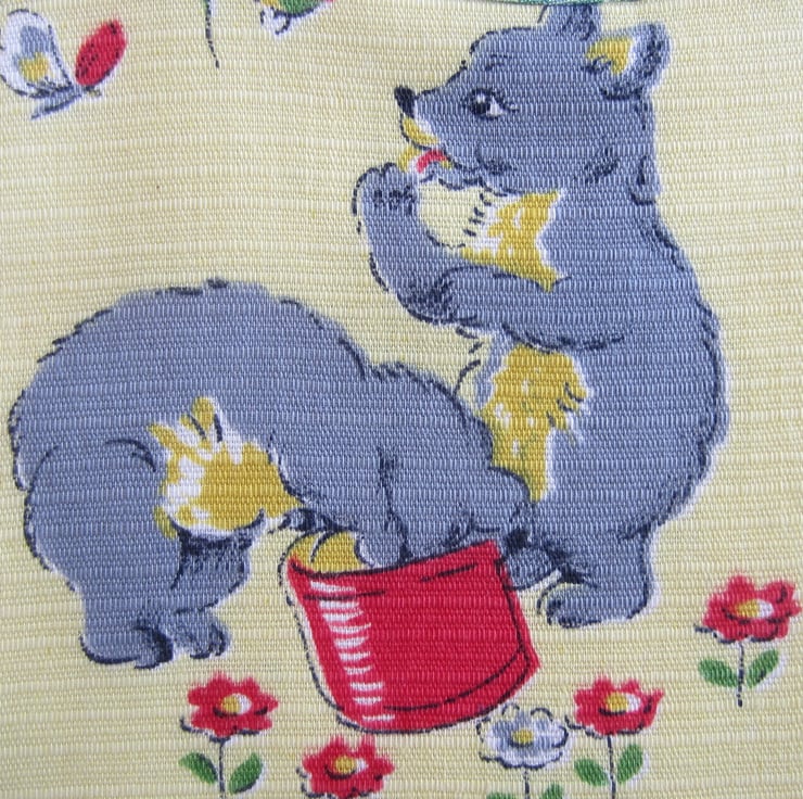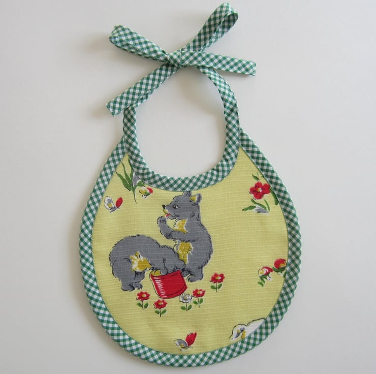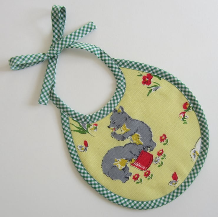 Newborn baby bib made from unused vintage 1950 s fabric. Backed with white towelling and edged in green and white bias binding. It features 2 grey bears eating honey and surrounded by red and white flowers and butterflies.