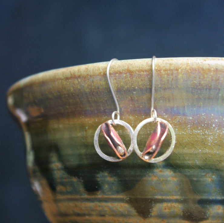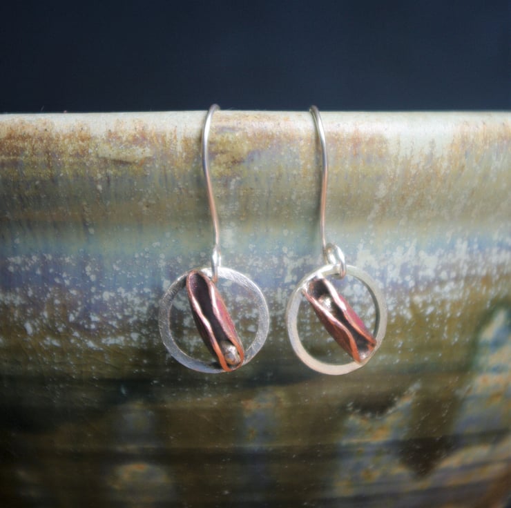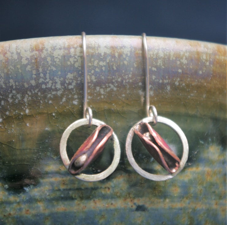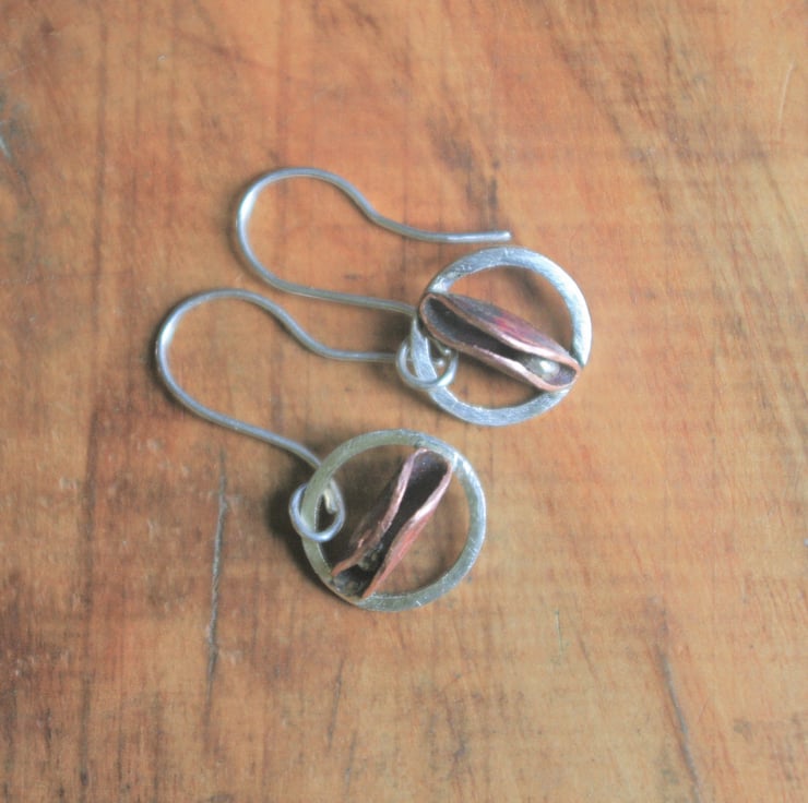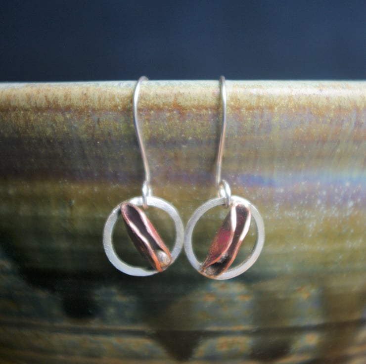 I have soldered a copper seed pod with a free running silver 'seed' inside, to the inside of a sterling silver circle made from square wire.The circle has a diameter of 12mm. The earhooks are handmade in sterling silver.