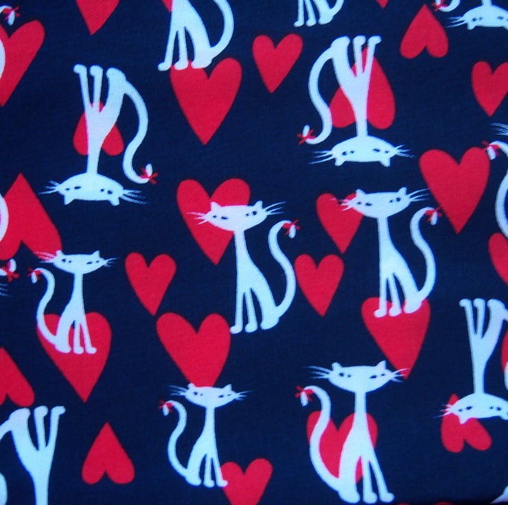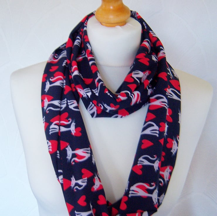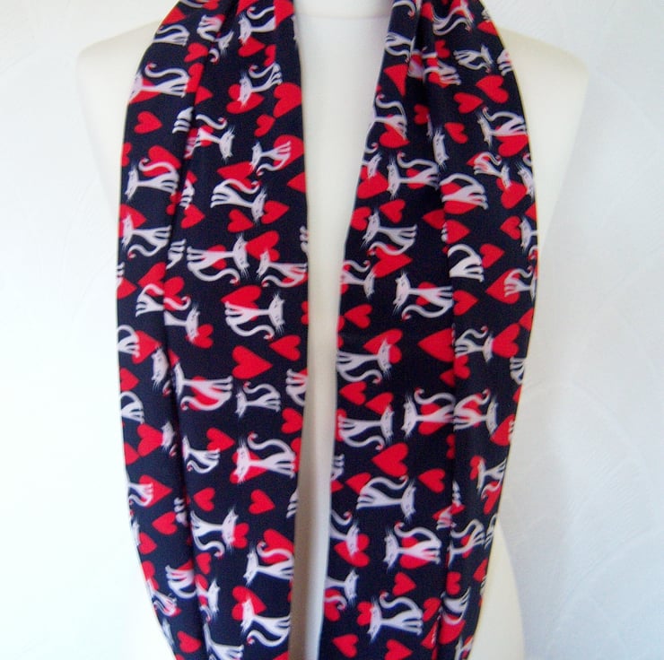 This is a hand made infinity scarf made from a lovely quality cat print chiffon fabric which has a lovely drape to it. The fabric has a navy background with white cats and red hearts printed on it (see photos of the fabric laid flat).