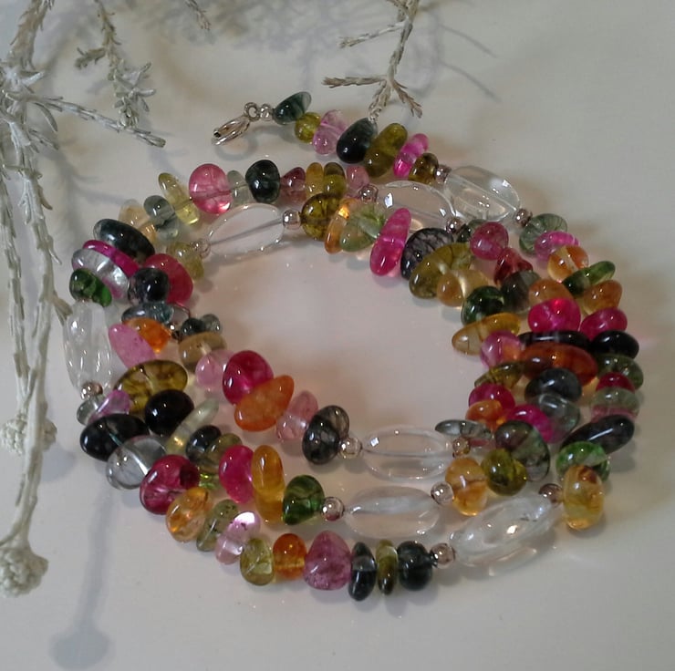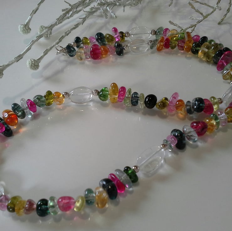 A lovely pretty necklace designed and hand crafted using diffused multi coloured genuine quartz tumble shaped pebble style gemstones with genuine irregular shaped oval clear quartz gemstones. Between the clear quartz genstones are 925 sterling silver beads to add a touch of luxury and sparkle around the neckline during wear. For the main construction coated professional stainless steel jewellers wire has been used for added strength and lasting durability.