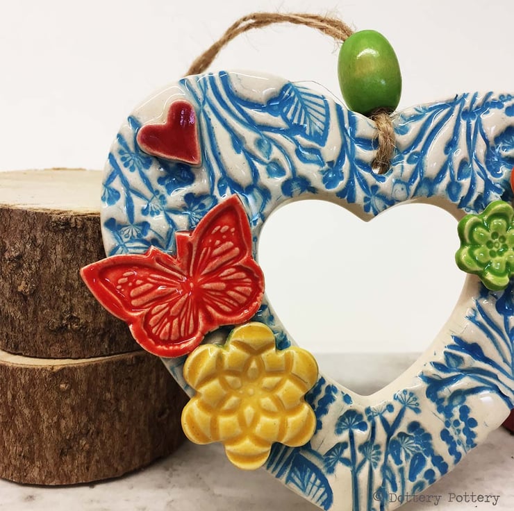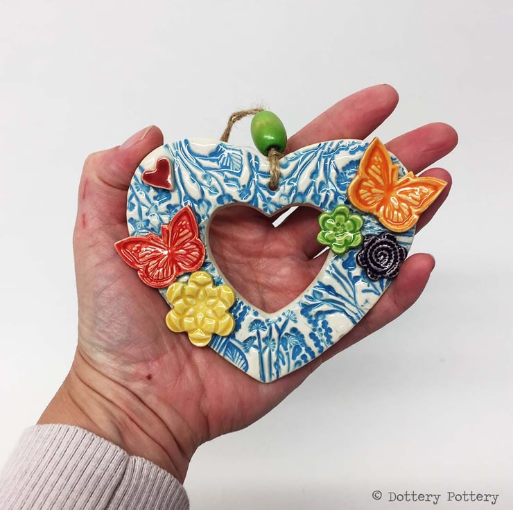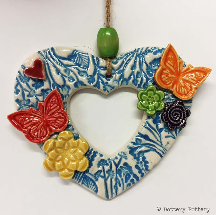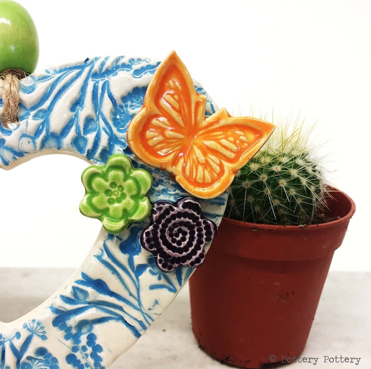 This butterfly themed hanging wreath decoration has been made from white earthenware clay and fired twice. It has a leafy background which is decorated with bright, glossy flowers and butterflies. The rustic style is complimented with a brown hanging string. It measures 12cm x 10cm and 1cm deep.